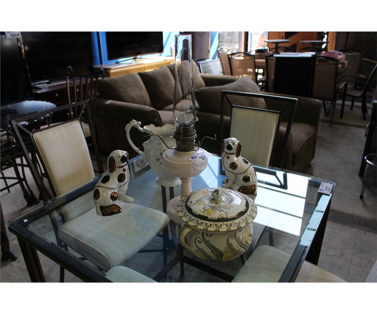 GROUP LOT OF VINTAGE COLLECTABLE PIECES; ALADDIN OIL LAMP, STAFFORDSHIRE DOGS, VICTORIAN PITCHER, AND A LIDDED CHAMBER POT