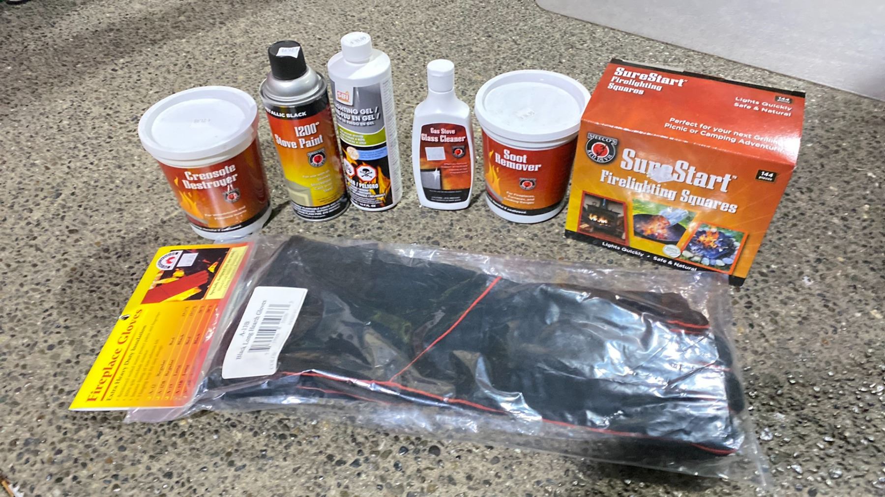 GROUP LOT OF WOODSTOVE/FIREPLACE CARE AND SAFETY KIT. EXTRA LONG HEARTH GLOVES WITH EXTRA HEAVY DUTY INSULATION, GLASS STOVE CLEANER, SOOT REMOVER, SURESTART FIRELIGHTING SQUARES, FIRELIGHTING GEL, BLACK STOVE PAINT, CRESOSOTE DESTROYER