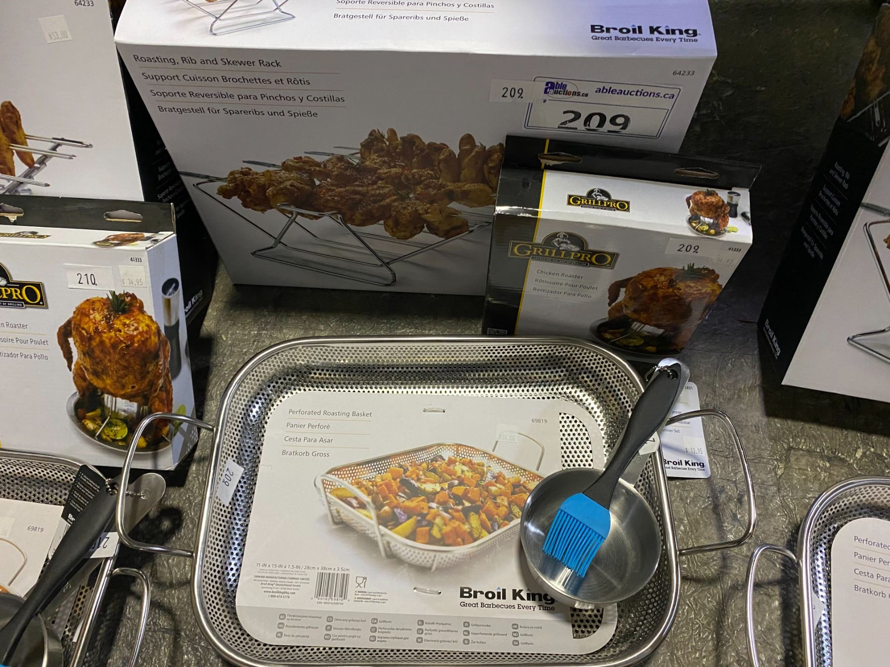 GROUP LOT ROASTING/RIB/SKEWER RACK, CHICKEN ROASTER, PERFORATED ROASTING BASKET AND BASTING CUP AND BRUSH