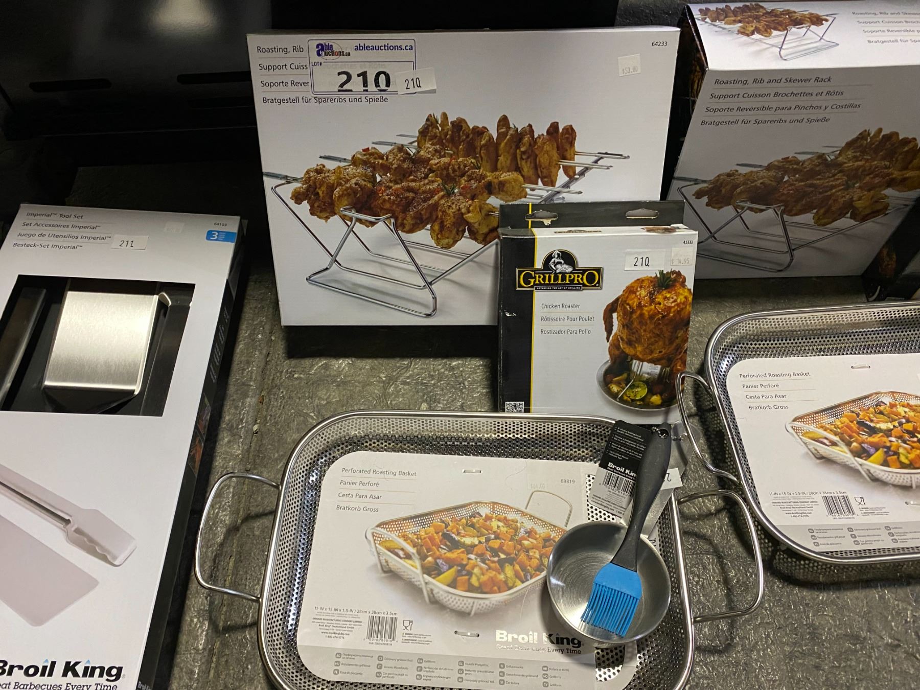 GROUP LOT ROASTING/RIB/SKEWER RACK, CHICKEN ROASTER, PERFORATED ROASTING BASKET AND BASTING CUP AND BRUSH