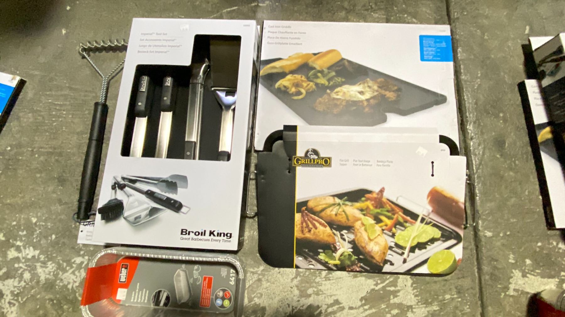 GROUP LOT TOOL SET, FLAT GRILL, CAST IRON GRIDDLE, DISPOSABLE PANS, CLEANING BRUSH