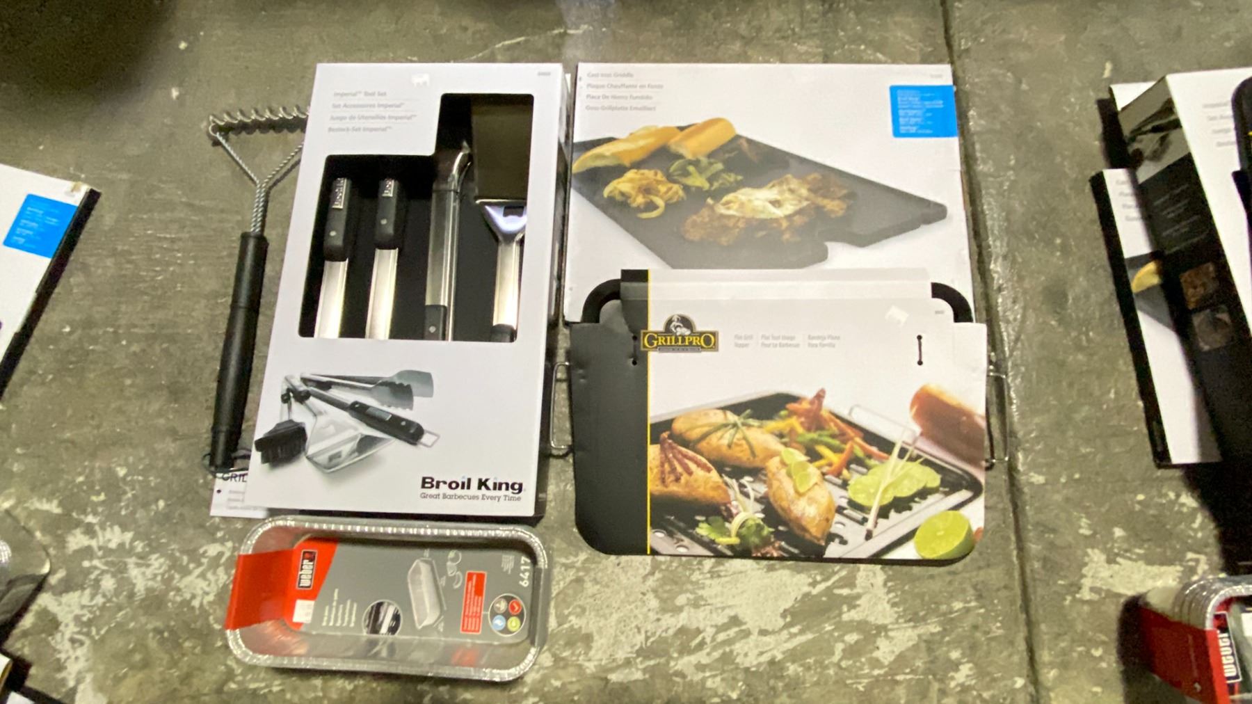 GROUP LOT TOOL SET, FLAT GRILL, CAST IRON GRIDDLE, DISPOSABLE PANS, CLEANING BRUSH
