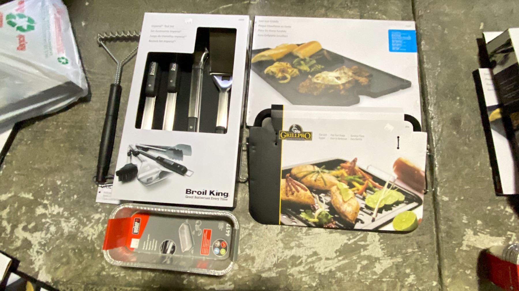 GROUP LOT TOOL SET, FLAT GRILL, CAST IRON GRIDDLE, DISPOSABLE PANS, CLEANING BRUSH