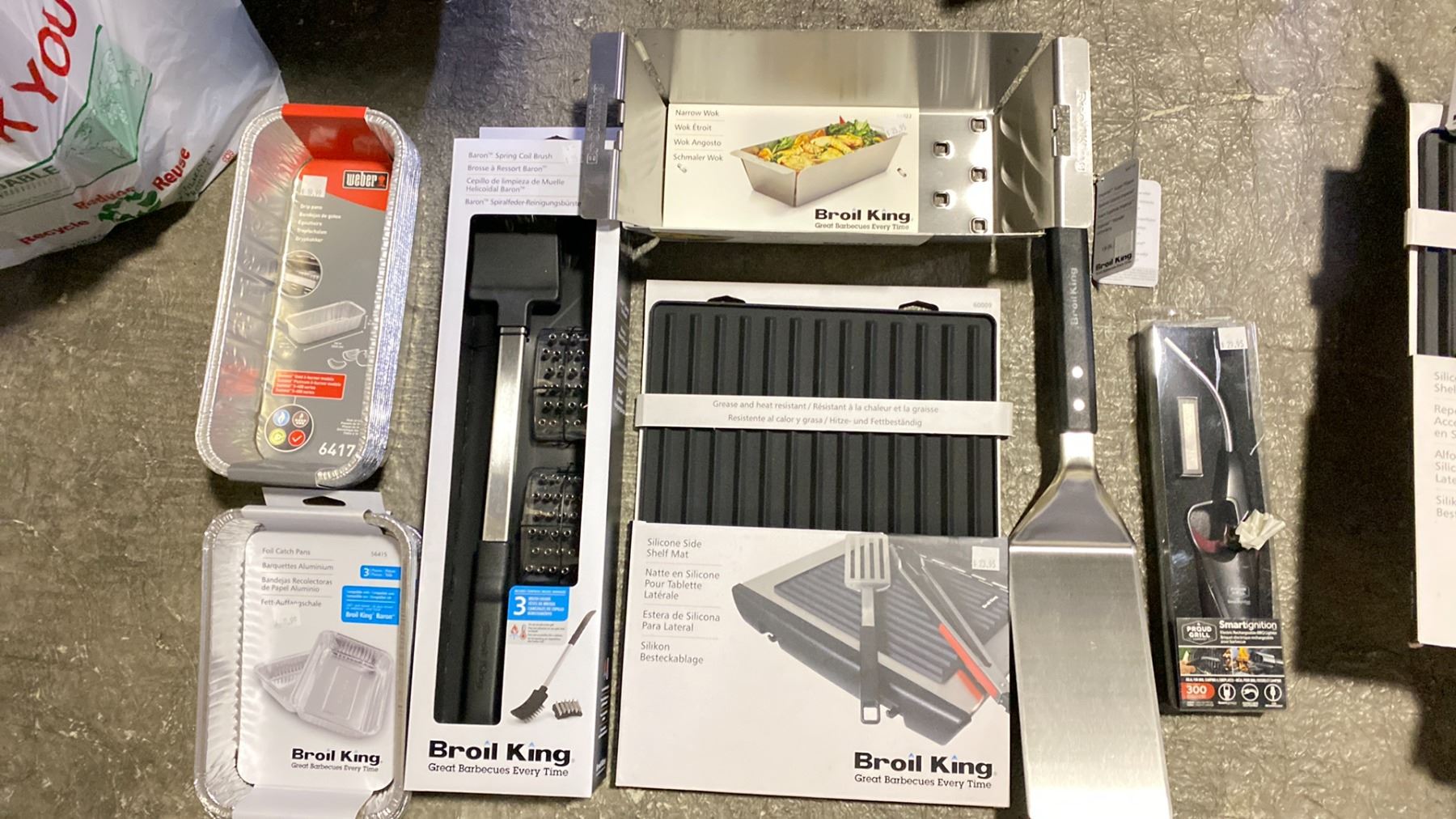 GROUP LOT WOK, CLEANING BRUSH, SILICONE SIDE SHELF MAT, LIGHTER, 3 PACKS FOIL PANS, LARGE SPATULA