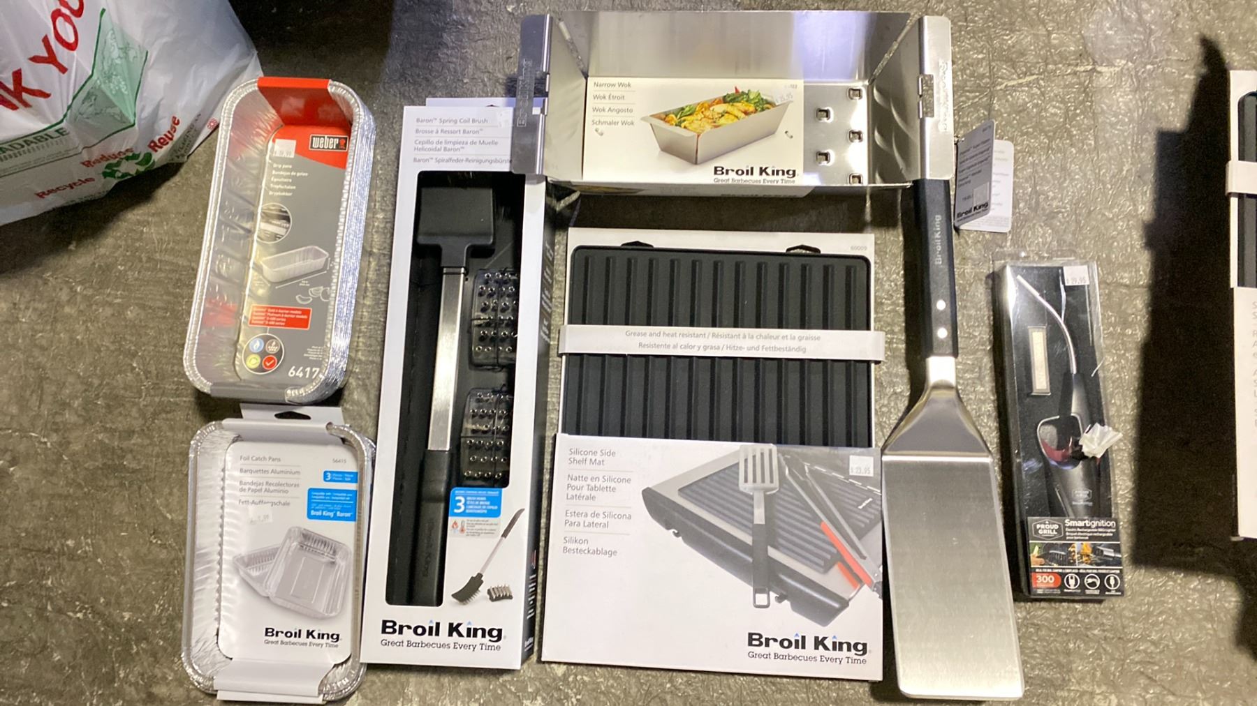 GROUP LOT WOK, CLEANING BRUSH, SILICONE SIDE SHELF MAT, LIGHTER, 3 PACKS FOIL PANS, LARGE SPATULA