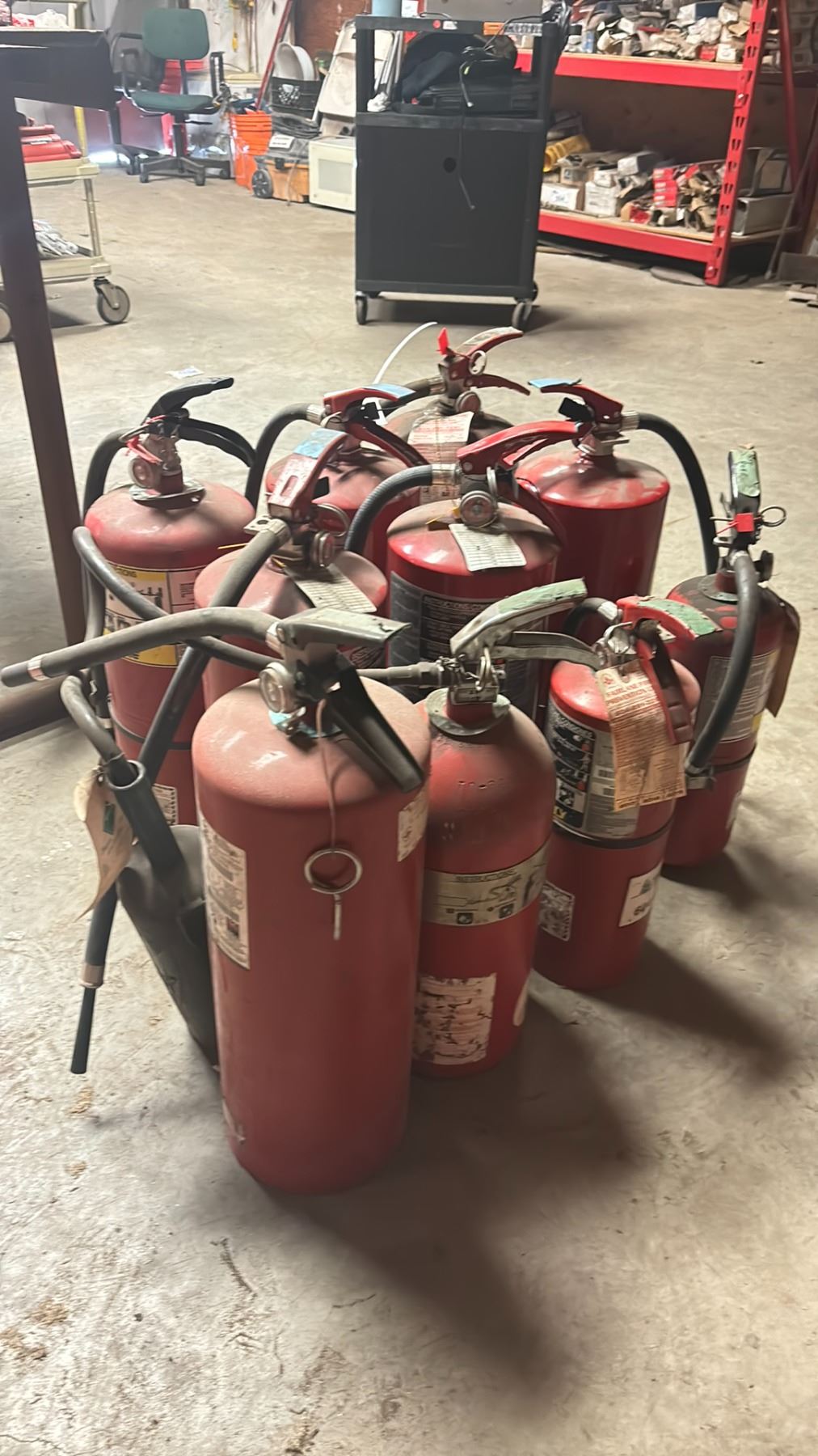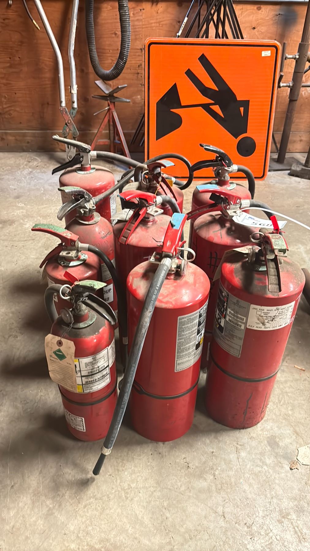 GROUP OF 10 VARIOUS SIZE FIRE EXTINGUISHERS