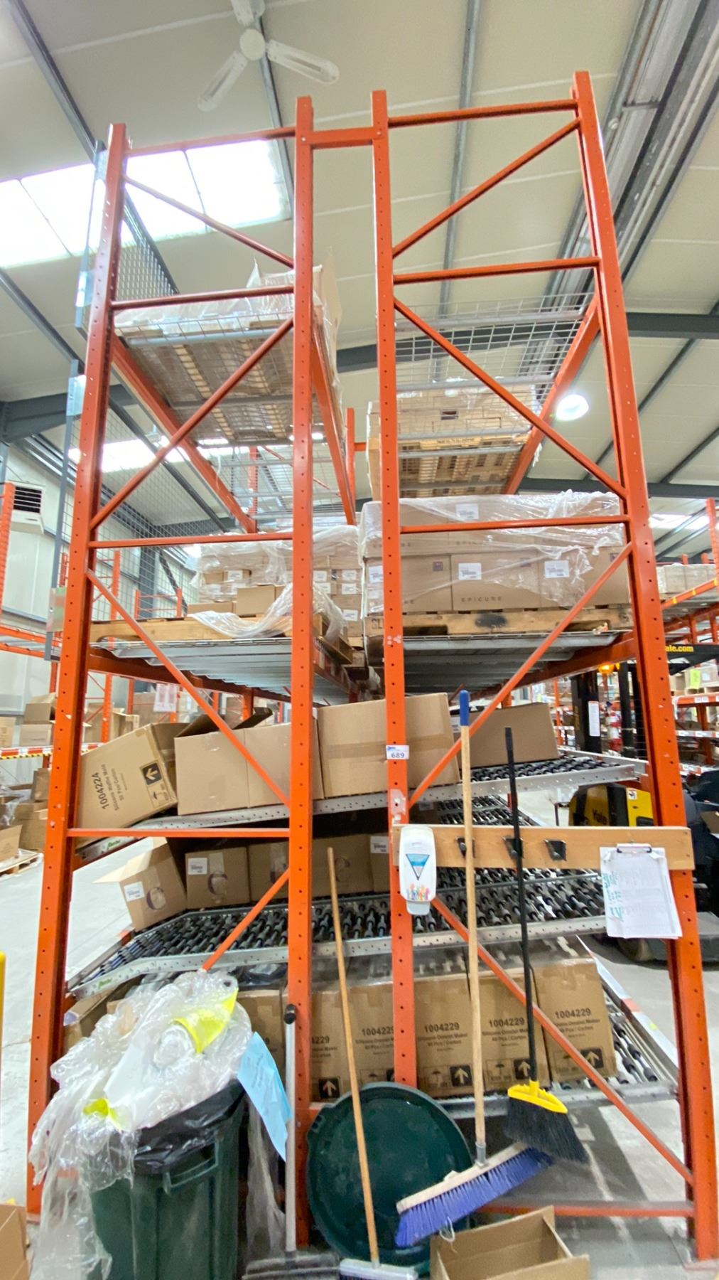 GROUP OF 16' HIGH BACK TO BACK RACKING. OVERALL 50' X 8' WITH BOX ROLLERS. INVENTORY INCLUDES 14 X 16' X 42" FRAMES, 84 X 8' BEAMS, 48 X 4' WIRE DECKING, 90 X 8' BOX ROLLERS, SAFETY CAGES INC. NO CONTENTS INCLUDED *DISMANTLING AND REMOVAL OF ALL RACKING WILL BE SCHEDULED AFTER THE AUCTION WITH THE BUYERS; REMOVAL PROCESS TO START JUNE 15*