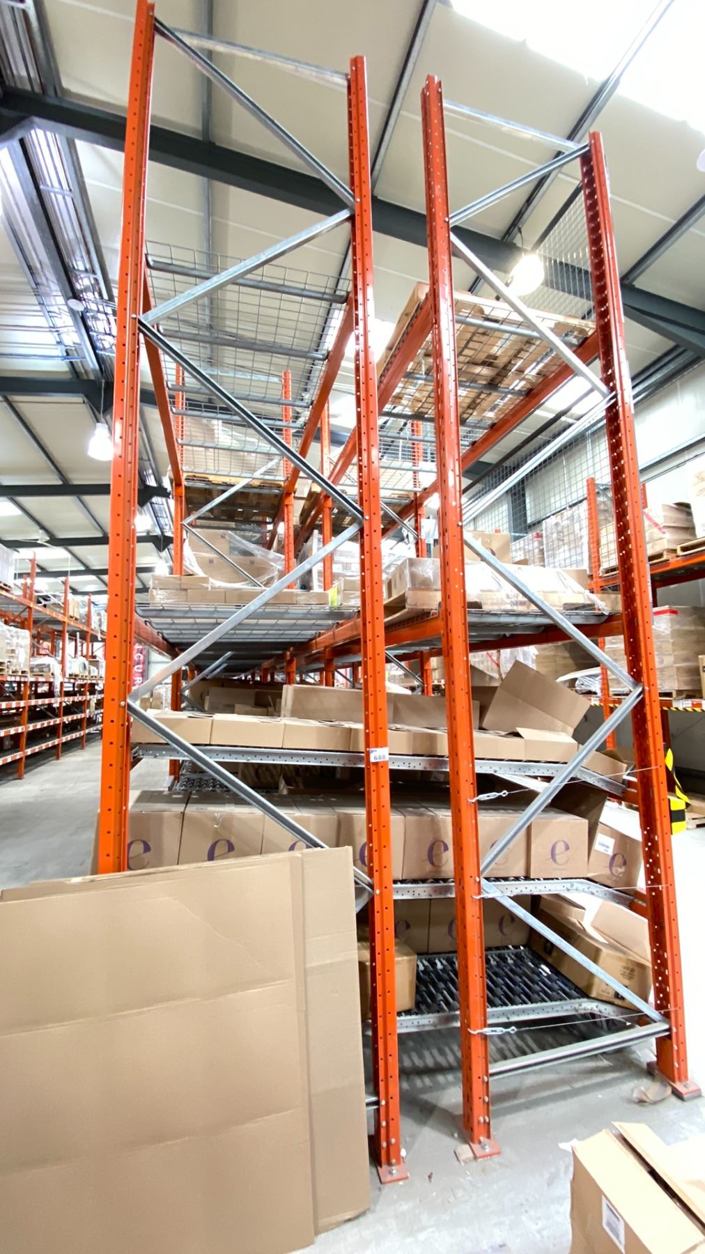 GROUP OF 16' HIGH BACK TO BACK RACKING. OVERALL 66' X 8' WITH BOX ROLLERS. INVENTORY INCLUDES 18 X 16' X 42" FRAMES, 110 X 8' BEAMS, 64 X 4' WIRE DECKING, 120 X 8' BOX ROLLERS, SAFETY CAGES INC. NO CONTENTS INCLUDED *DISMANTLING AND REMOVAL OF ALL RACKING WILL BE SCHEDULED AFTER THE AUCTION WITH THE BUYERS; REMOVAL PROCESS TO START JUNE 15*