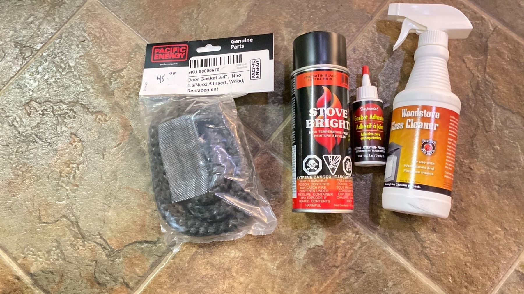 GROUP OF 3/4-INCH STOVE GASKET, STOVE PAINT, STOVE GLASS CLEANER, AND GASKET ADHESIVE.