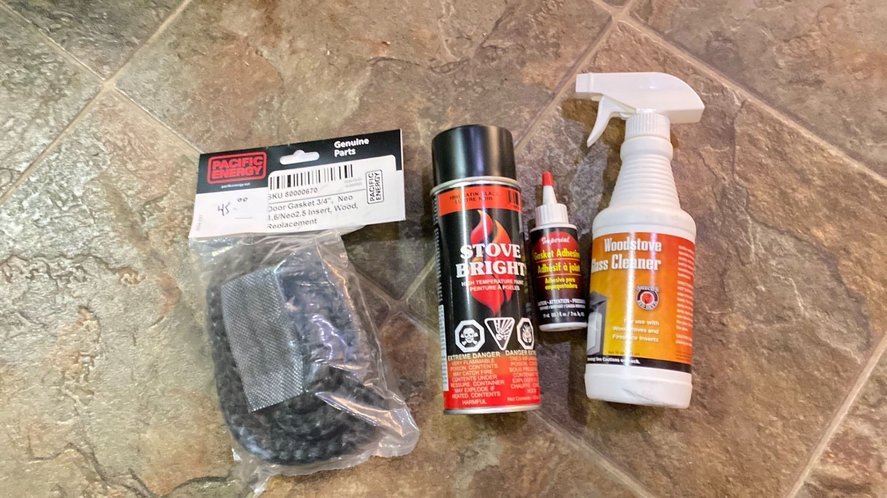 GROUP OF 3/4-INCH STOVE GASKET, STOVE PAINT, STOVE GLASS CLEANER, AND GASKET ADHESIVE.