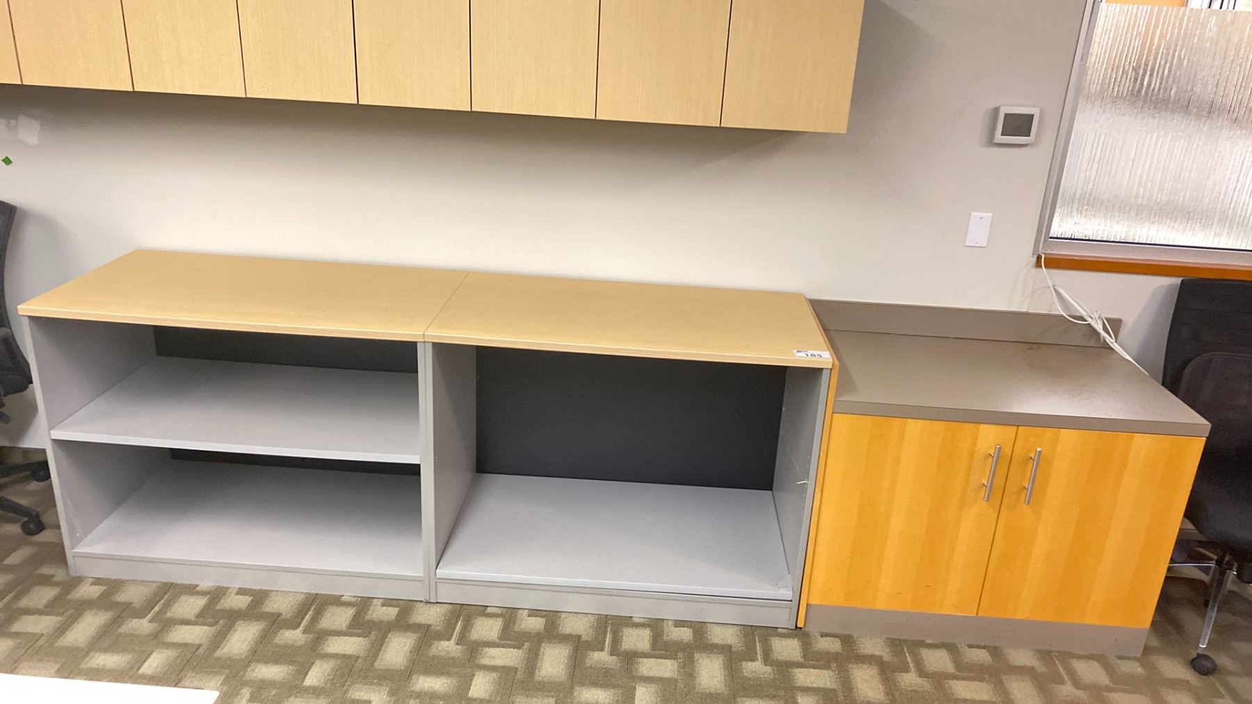 GROUP OF 3 ASSORTED OFFICE CABINETS - (2) GREY & NATURAL APPROX. 4FT ACROSS X 2FT WIDE X 3FT HIGH AND (1) DARK GREY & NATURAL APPROX 3 1/2FT ACROSS X 2FT. WIDE X 2 1/2FT HIGH