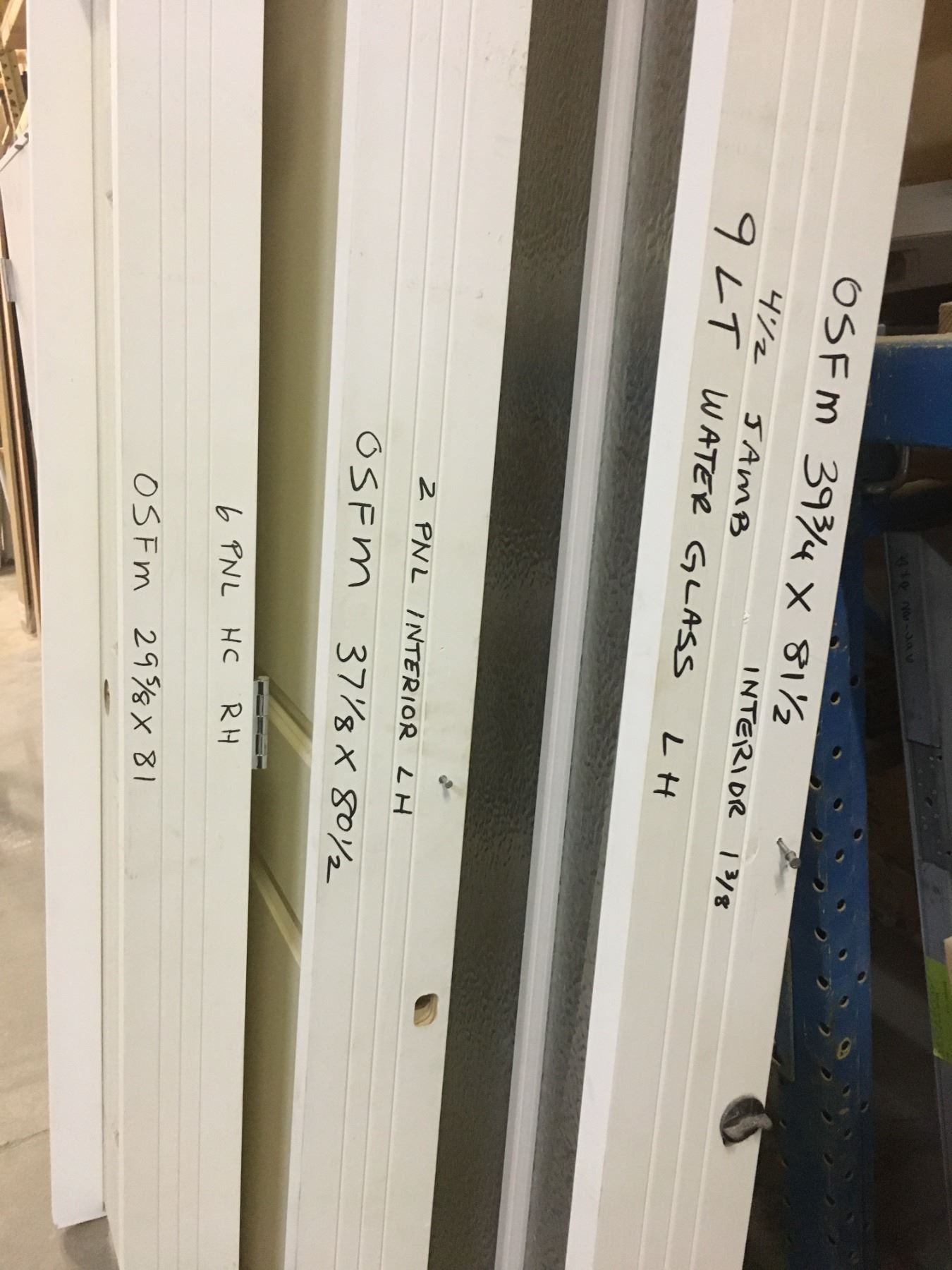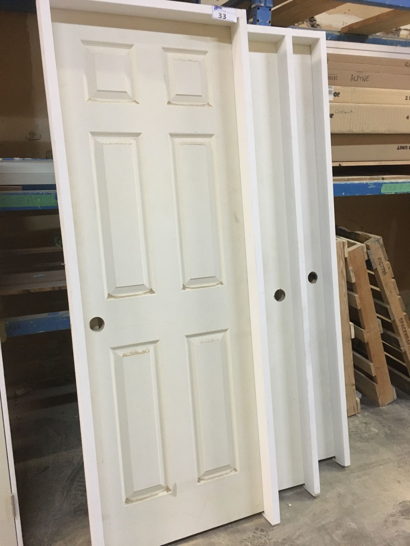 GROUP OF 3 ASSORTED SIZE WHITE DOORS WITH FRAMES (1 HAS GLASS PANEL FRONT)