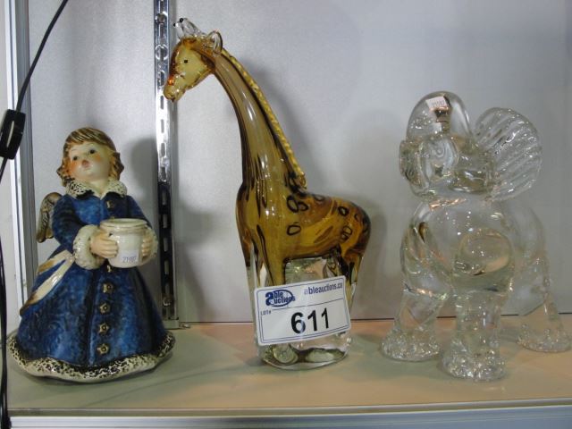 GROUP OF 3 COLLECTABLES; GLASS SCULPTED ELEPHANT, GLASS GIRAFFE AND GOBAL WEST GERMAN FIGURINE