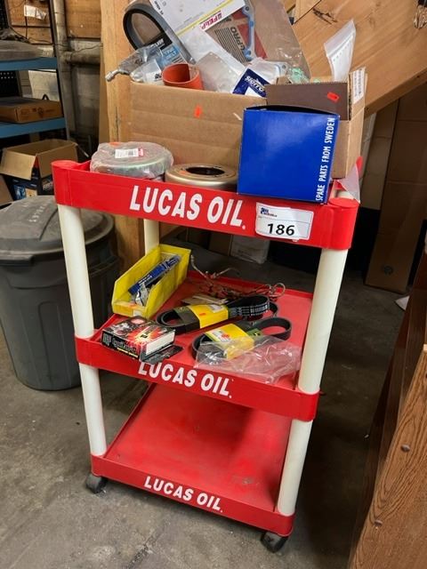GROUP OF 3 CRAPPY BOOKSHELVES AND LUCAS OIL MOBILE DISPLAY SHELF ON CASTORS. INC JOHN DEERE BELTS, HYDRAULIC FITTINGS, GASKETS, ELEC IGNITION KIT, ETC