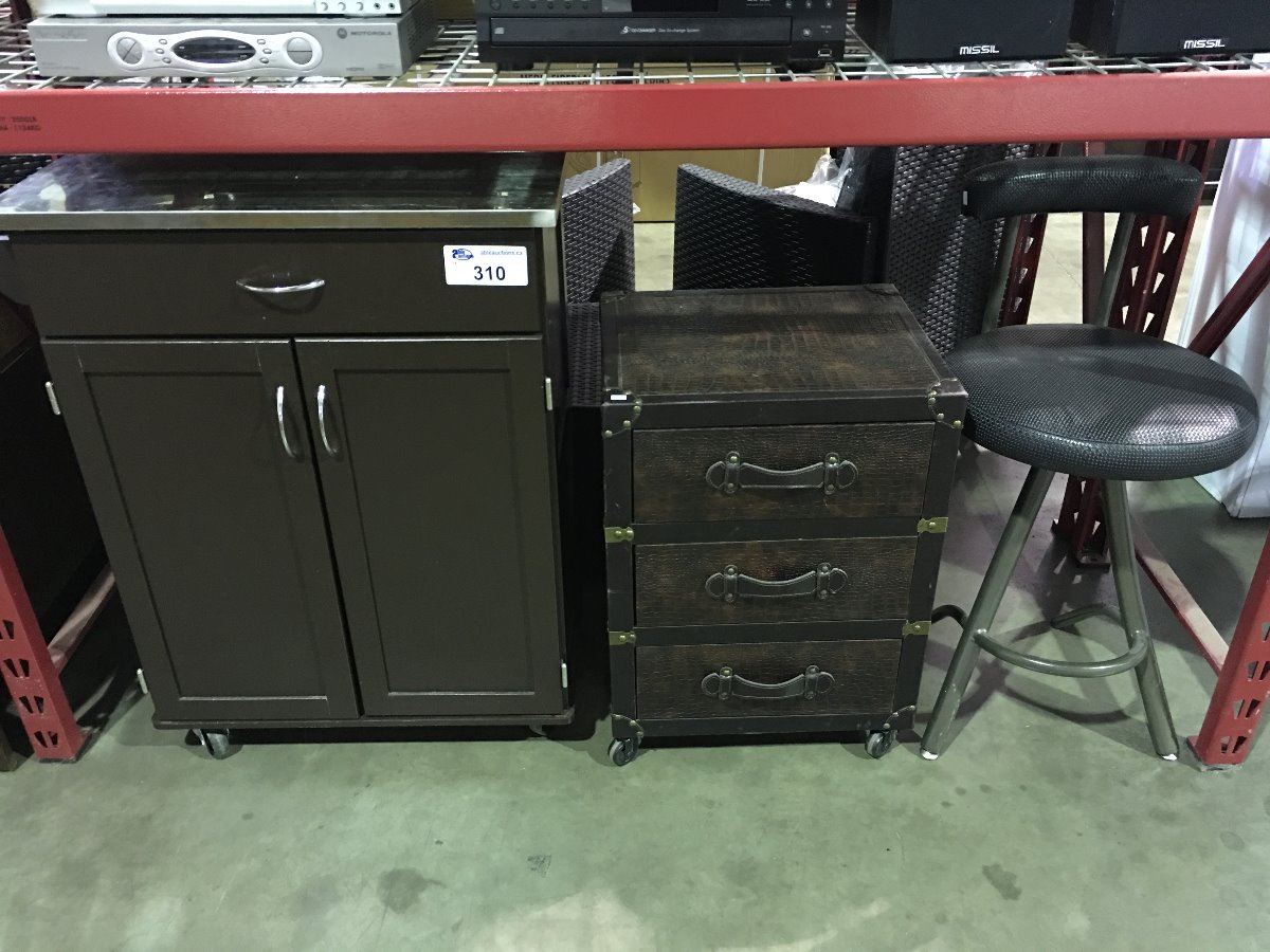 GROUP OF 3 FURNITURE PIECES - KITCHEN ISLAND CABINET, 3 DRAWER ROLLING STORAGE UNIT & BAR STOOL