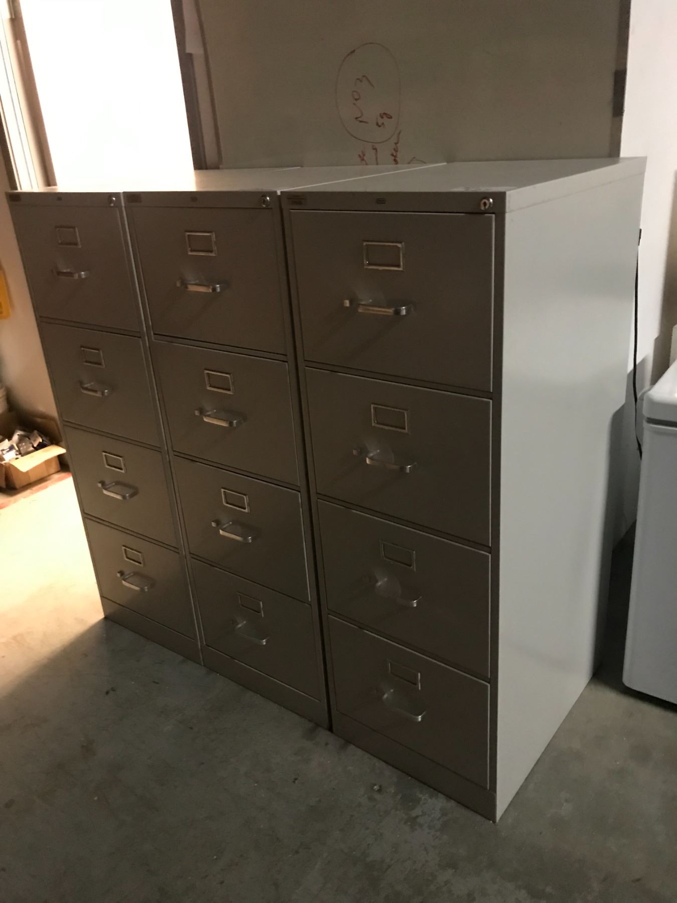GROUP OF 3 HON GREY METAL 4 DRAWER FILING CABINETS & 4FT X 8FT WHITE BOARD