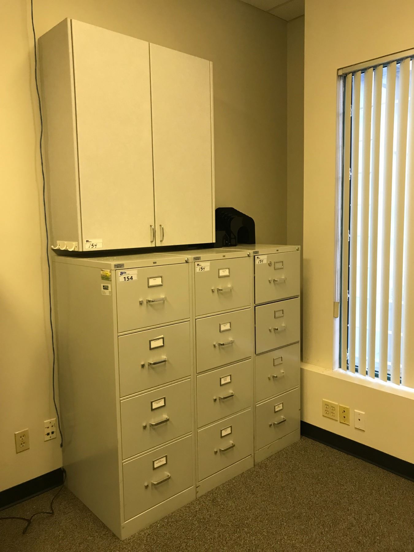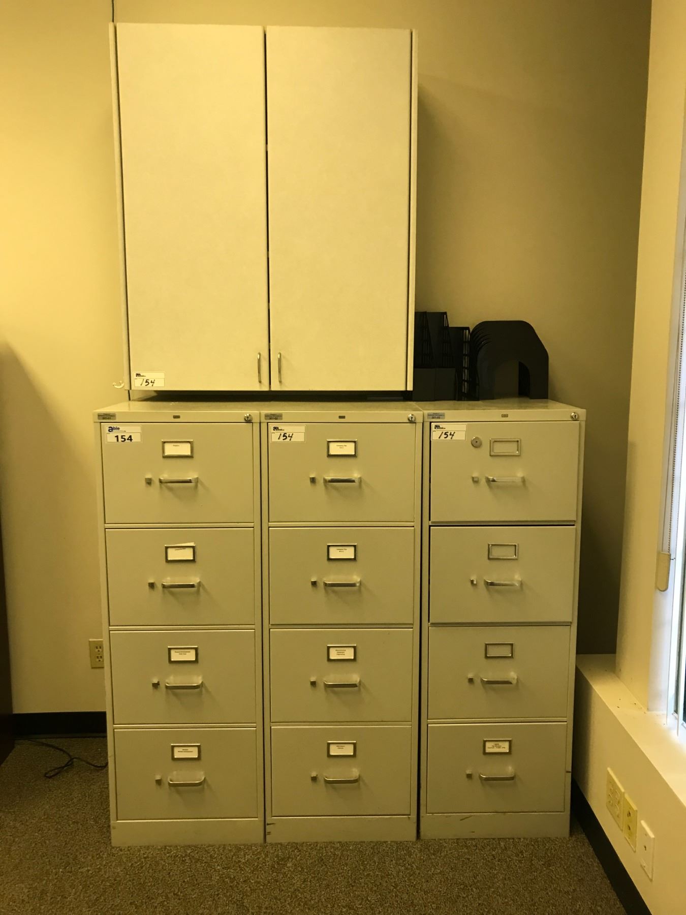 GROUP OF 3 HON GREY METAL 4 DRAWER FILING CABINETS AND WALL MOUNT CABINET