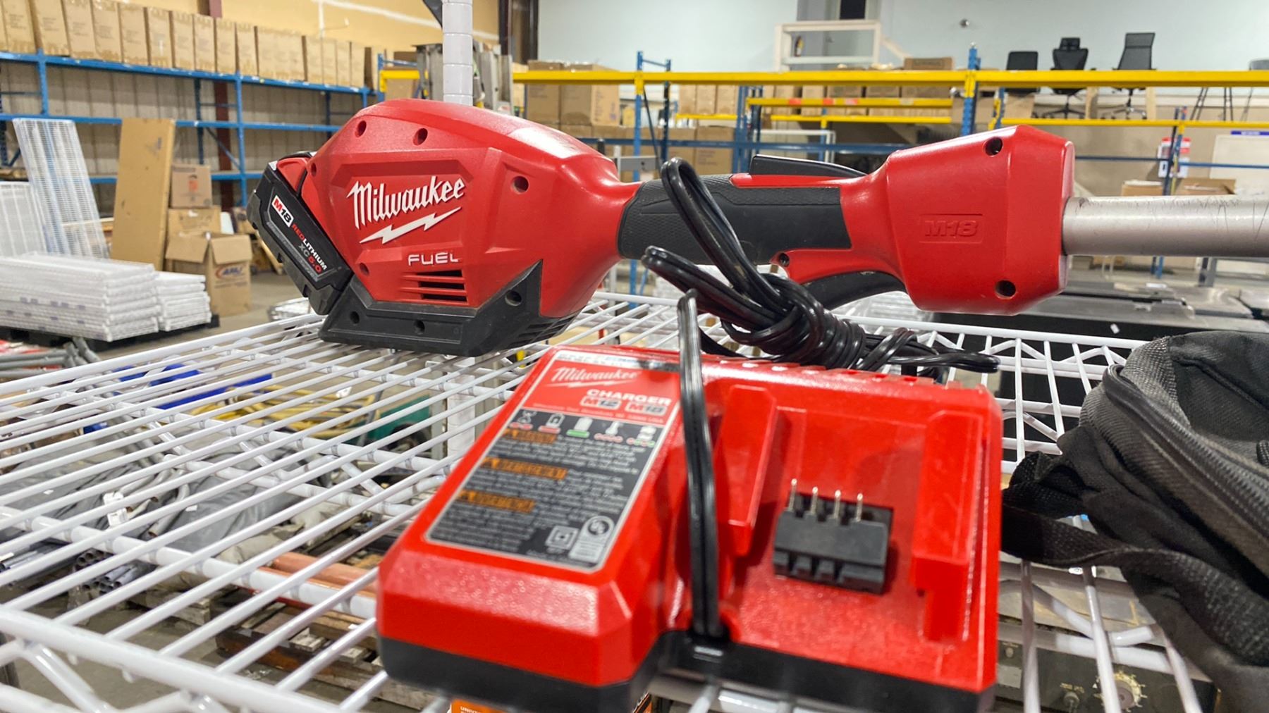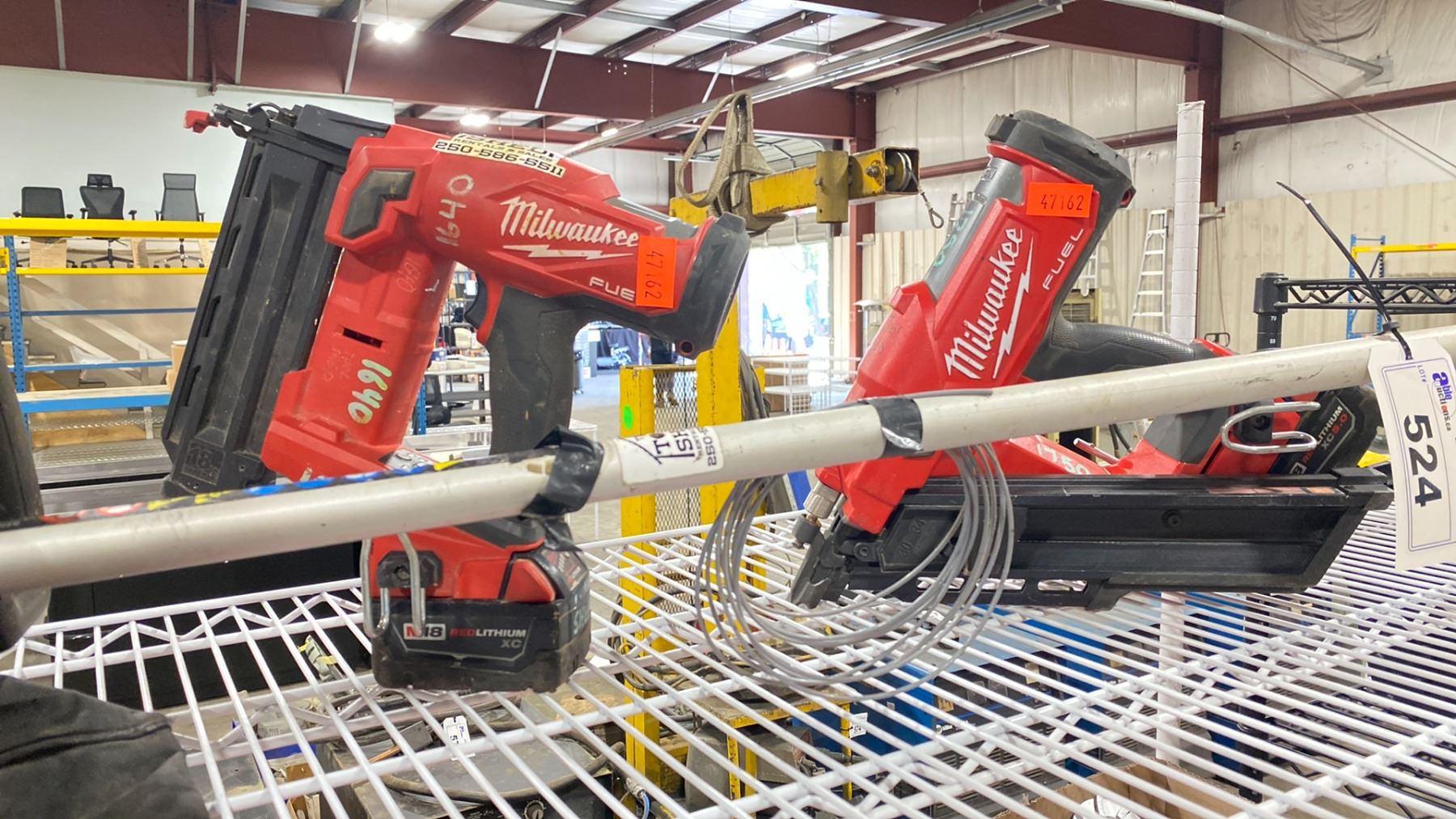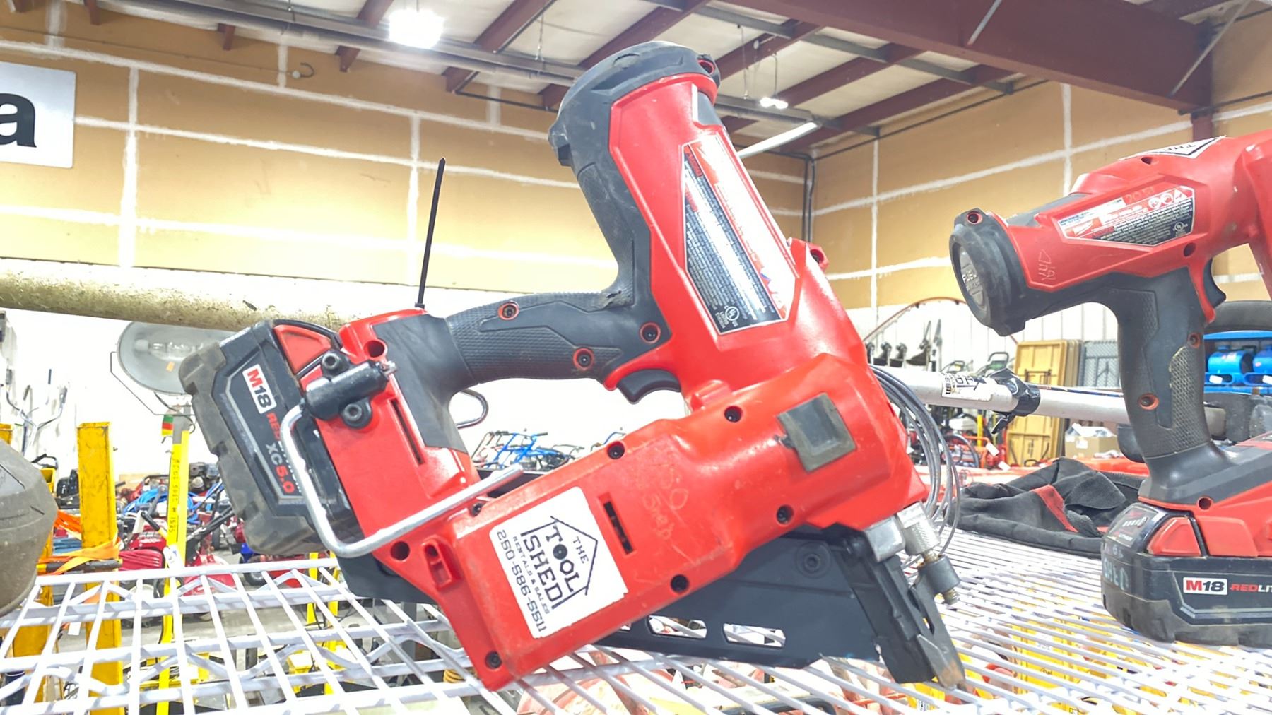 GROUP OF 3 MILWAUKEE FUEL CORDLESS POWER TOOLS - NAIL GUN/STAPLE GUN AND WEED EATER WITH CHARGER & (3) 18 VOLT BATTERIES