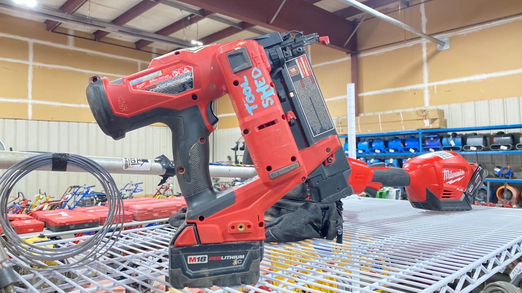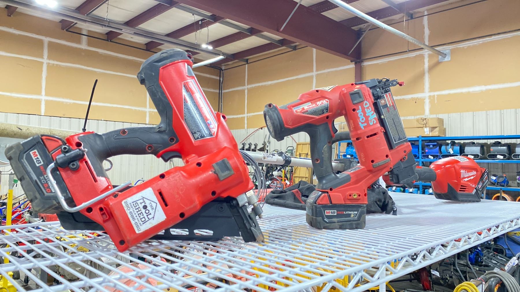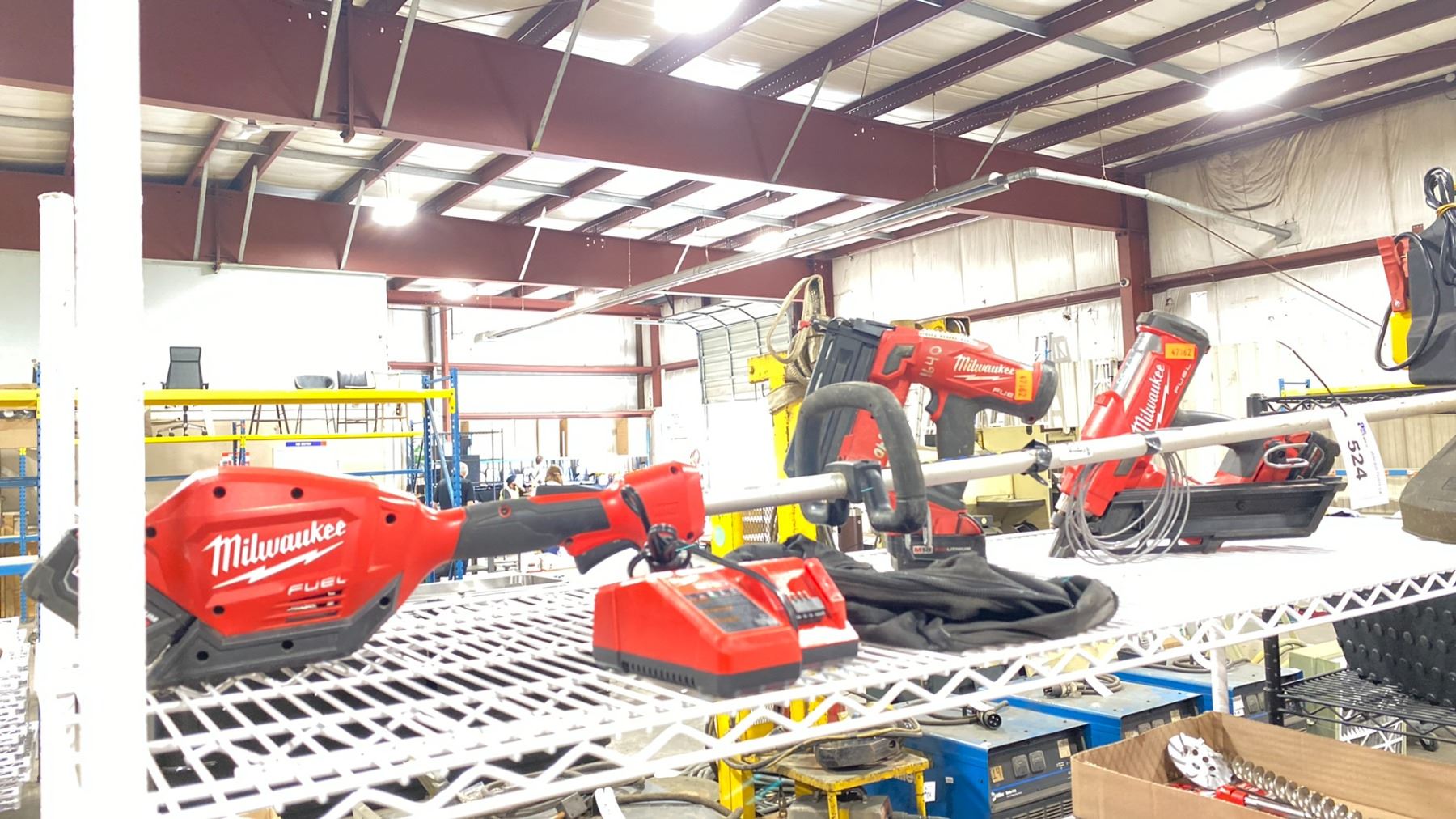 GROUP OF 3 MILWAUKEE FUEL CORDLESS POWER TOOLS - NAIL GUN/STAPLE GUN AND WEED EATER WITH CHARGER & (3) 18 VOLT BATTERIES