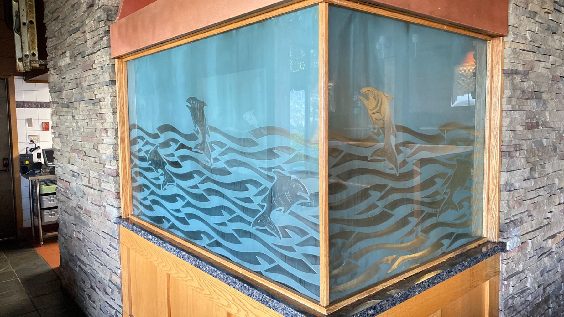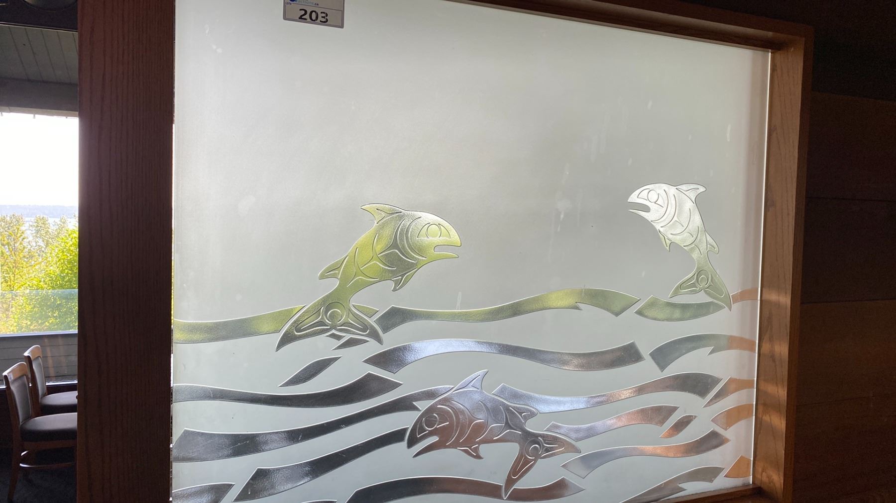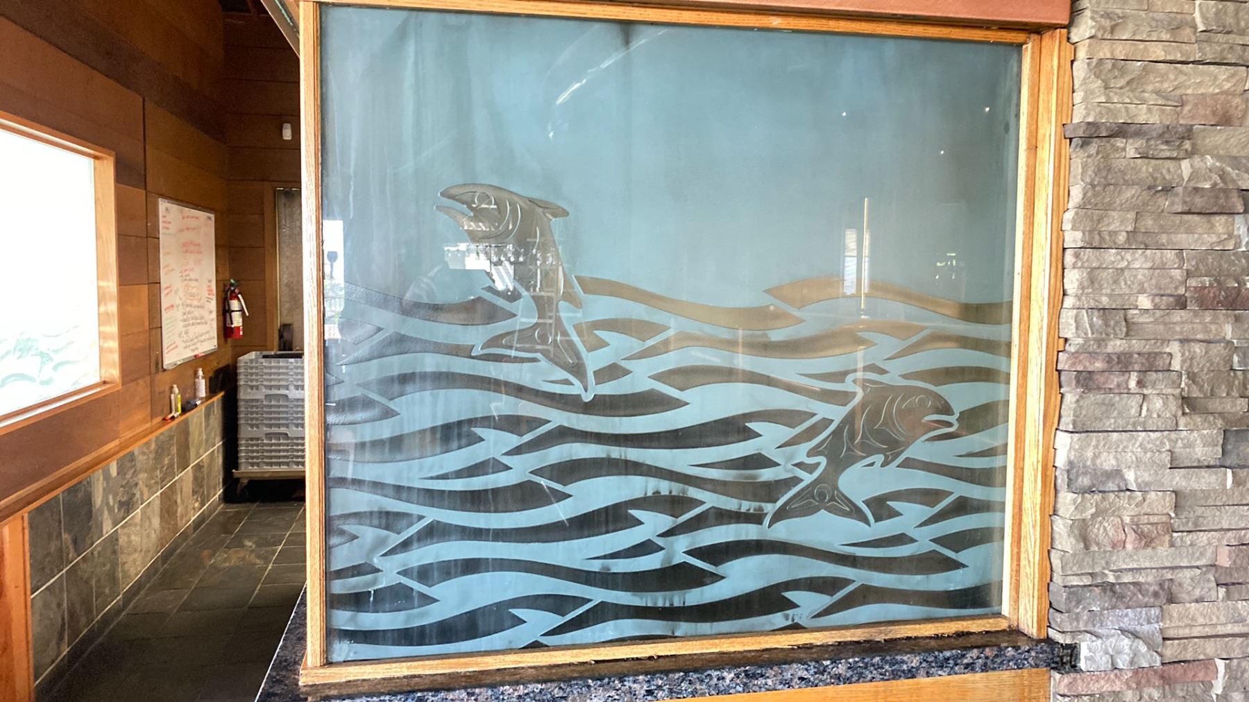 GROUP OF 3 MOUNTED AND SECURED ETCHED AND CARVED GLASS WITH SALMON MOTIF ALL DIFFERENT SIZES