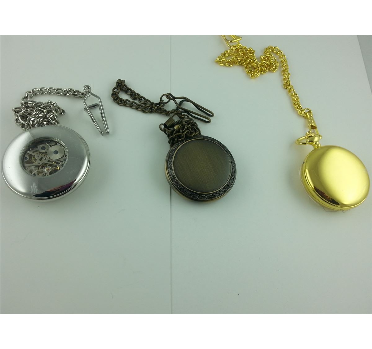 GROUP OF 3 POCKET WATCHES INCLUDING; NEW SEE THROUGH MECHANICAL POCKET WATCH, AND 2 NEW QUARTZ POCKET WATCHES