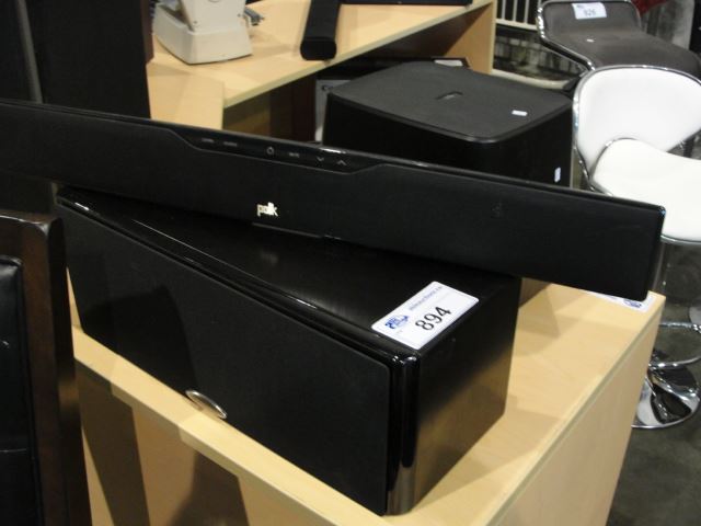 GROUP OF 3 POLK HOME AUDIO SPEAKER SET; SOUND BAR, CENTER SPEAKER AND POWERED SUB WOOFER