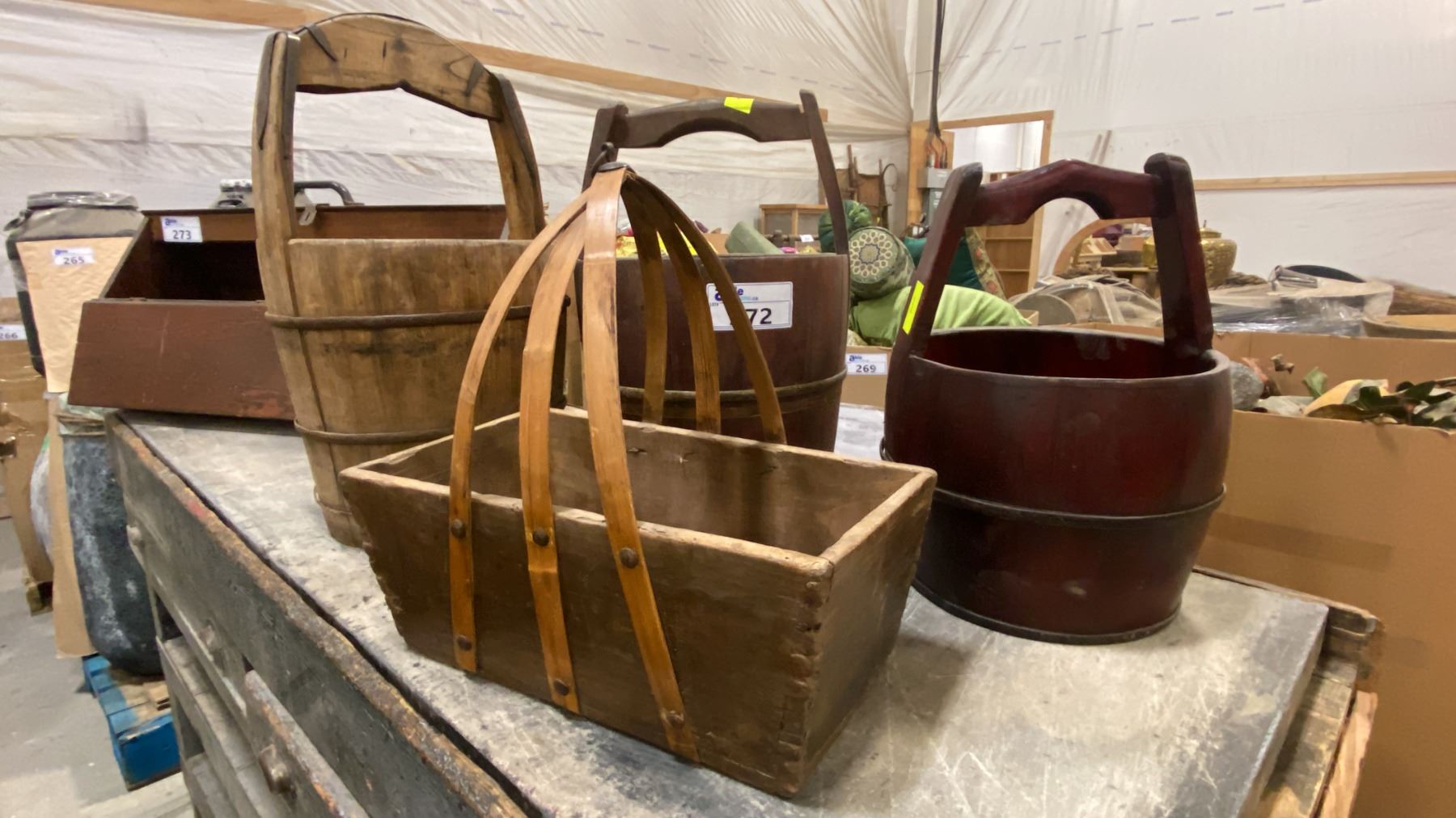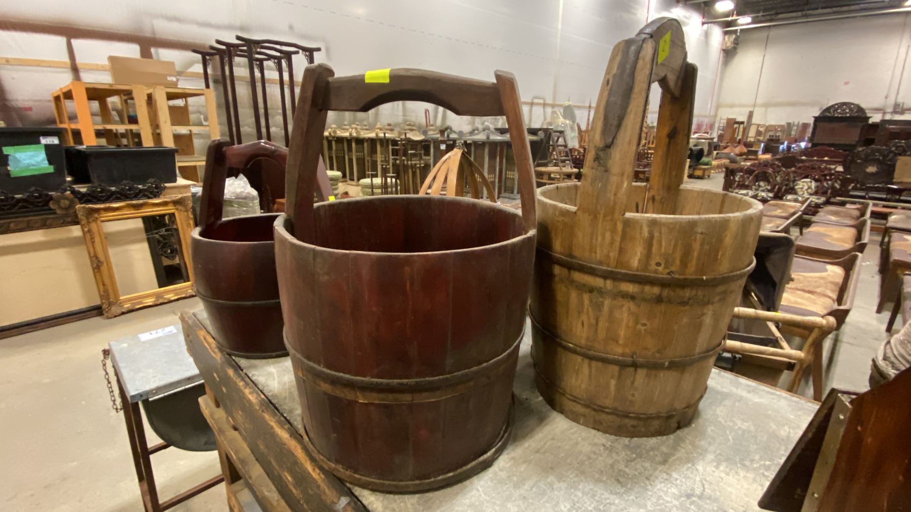 GROUP OF 3 PRIMITIVE WOODEN WATER BUCKETS & DOVETAILED PICNIC BASKET