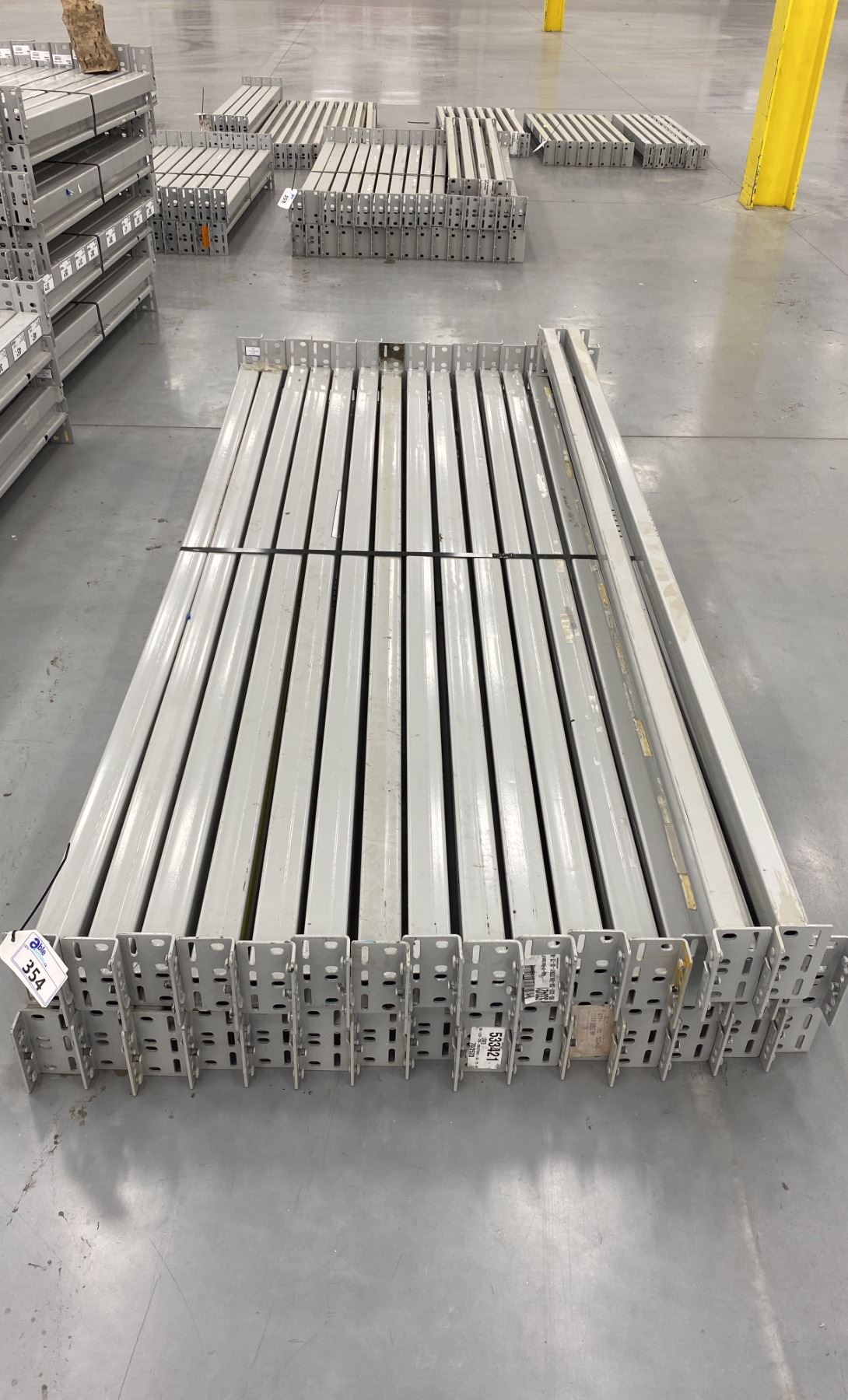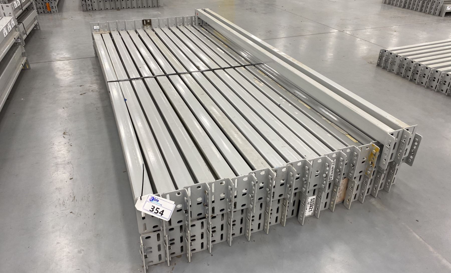 GROUP OF 32 GREY INDUSTRIAL PALLET RACKING SIDE BEAMS 97" X 2.5"