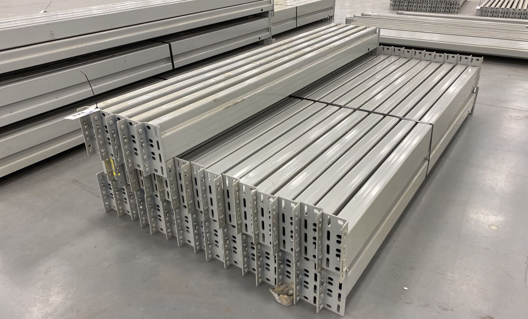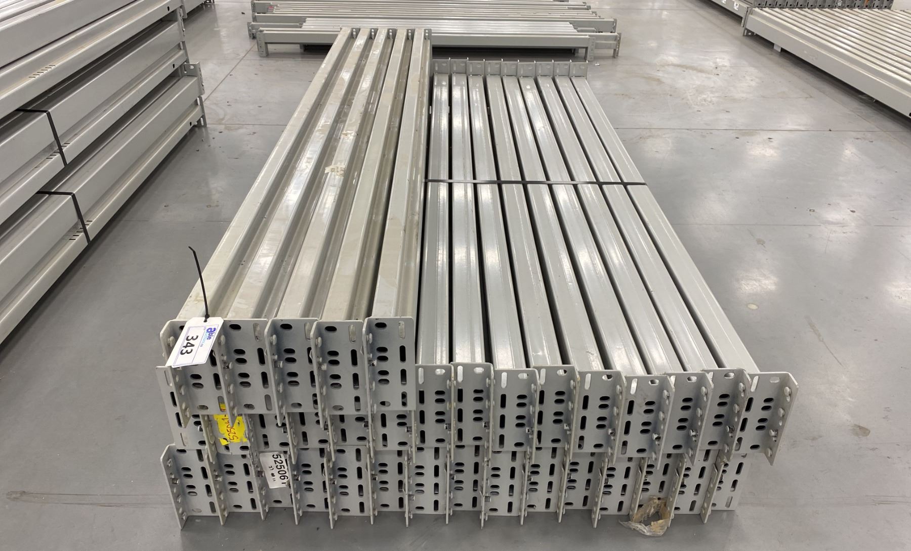 GROUP OF 35 GREY INDUSTRIAL PALLET RACKING SIDE BEAMS 84" X 5.5"