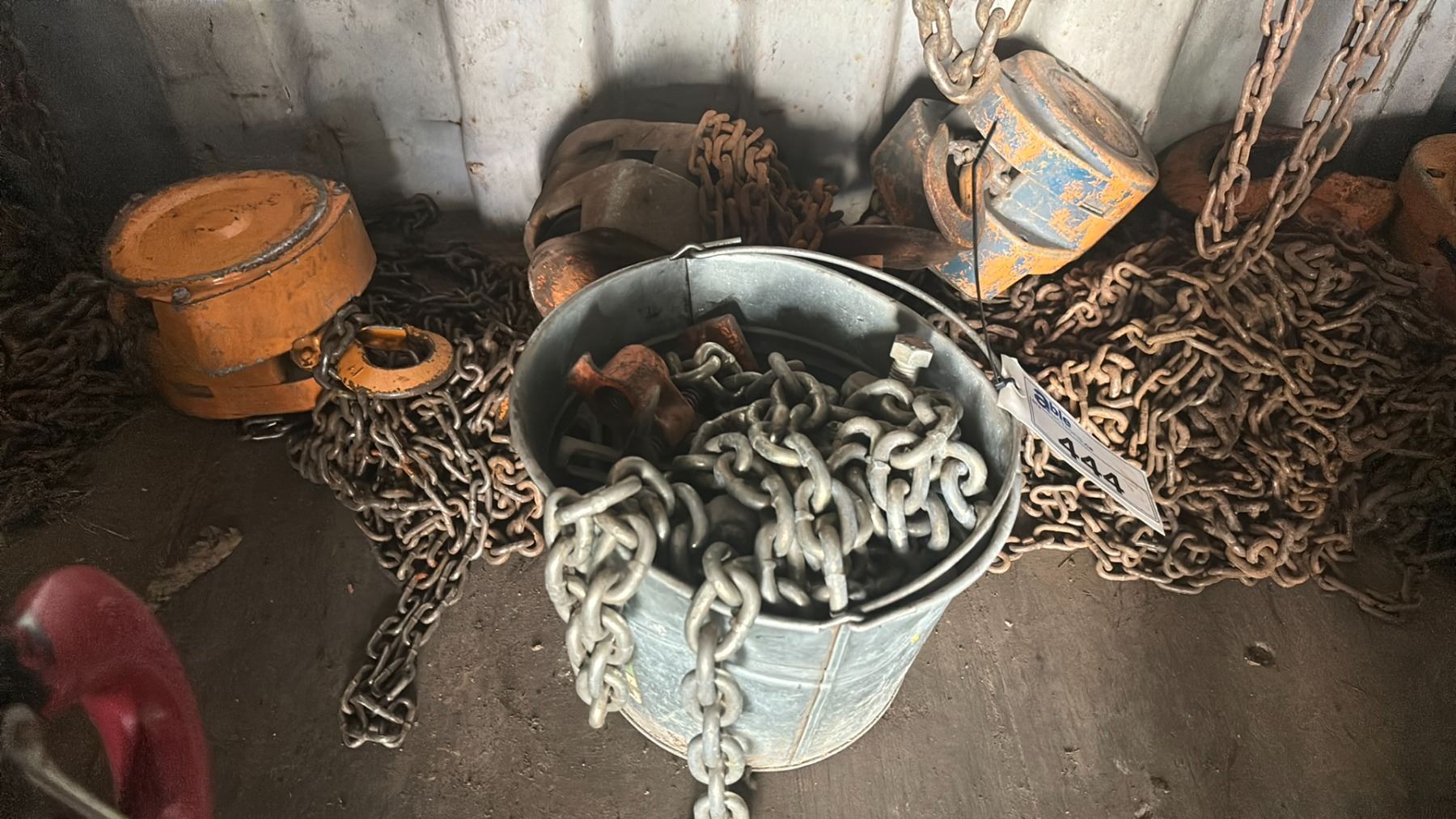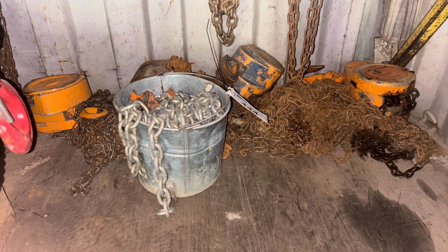 GROUP OF 4 ASSORTED CHAIN HOISTS & A BUCKET OF CHAIN