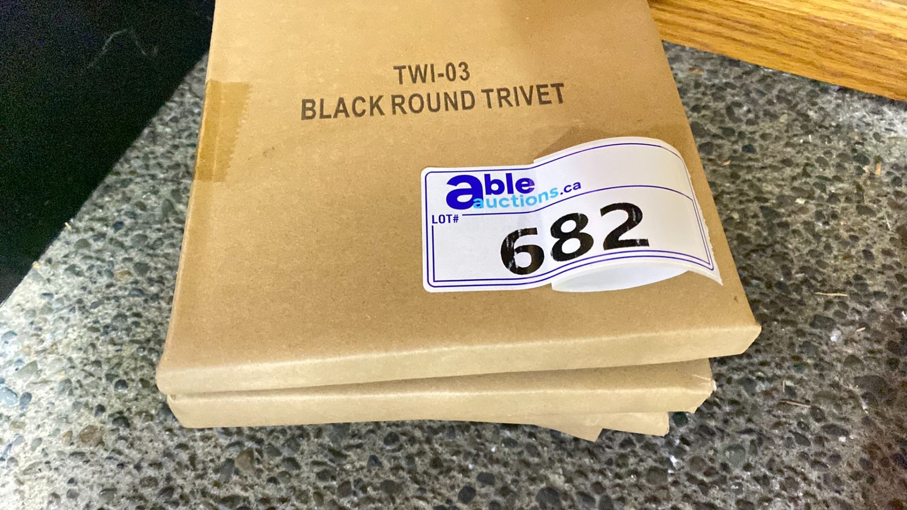 GROUP OF 4 BLACK ROUND CAST IRON TRIVETS RETAIL $300