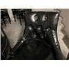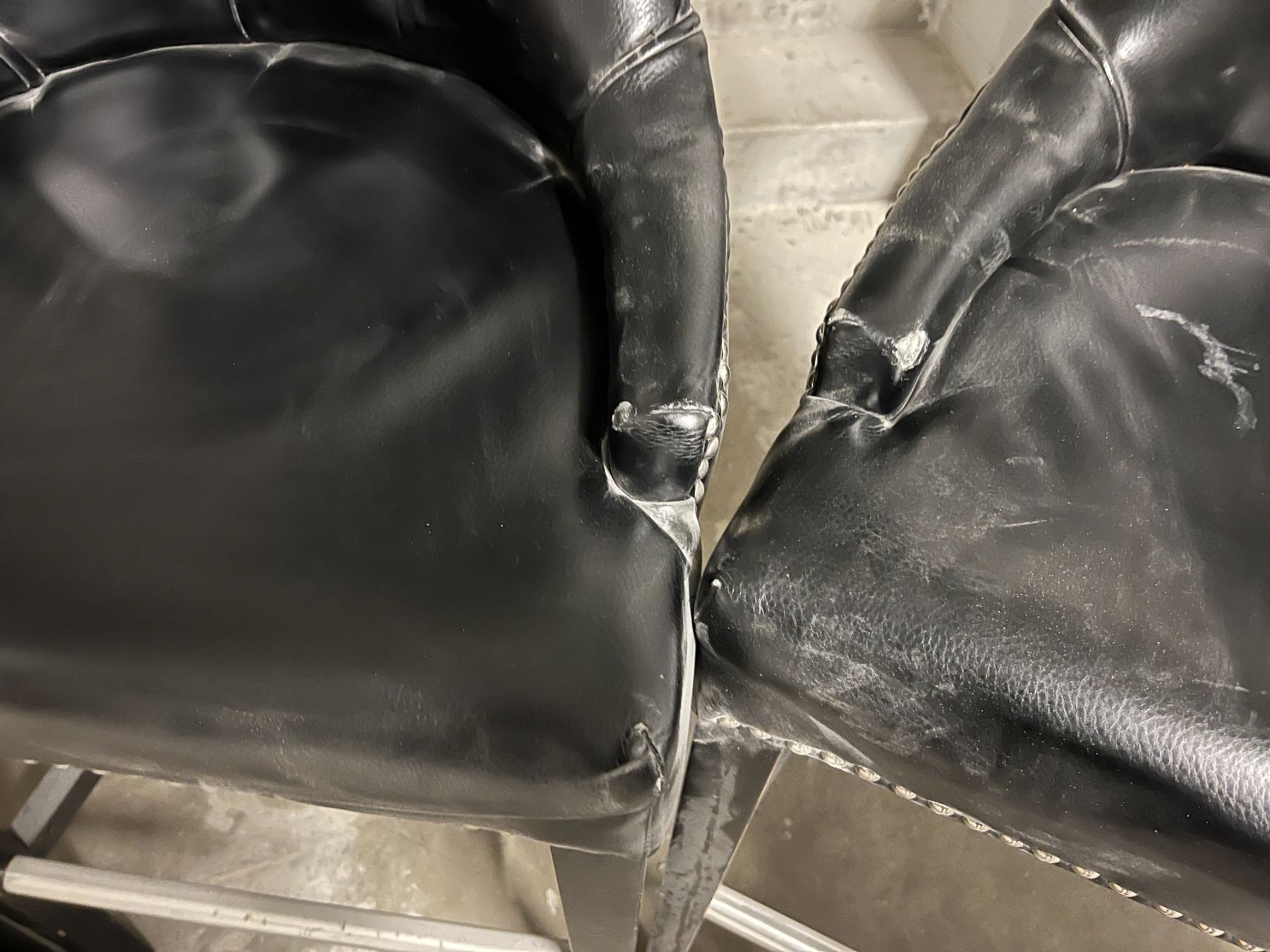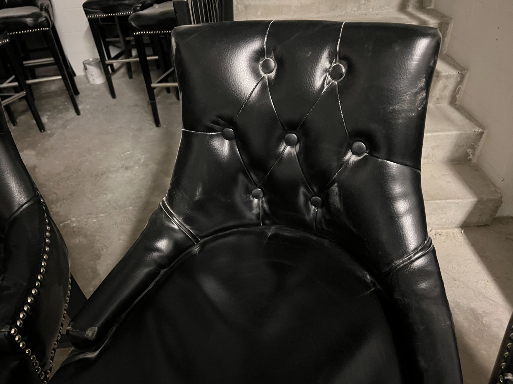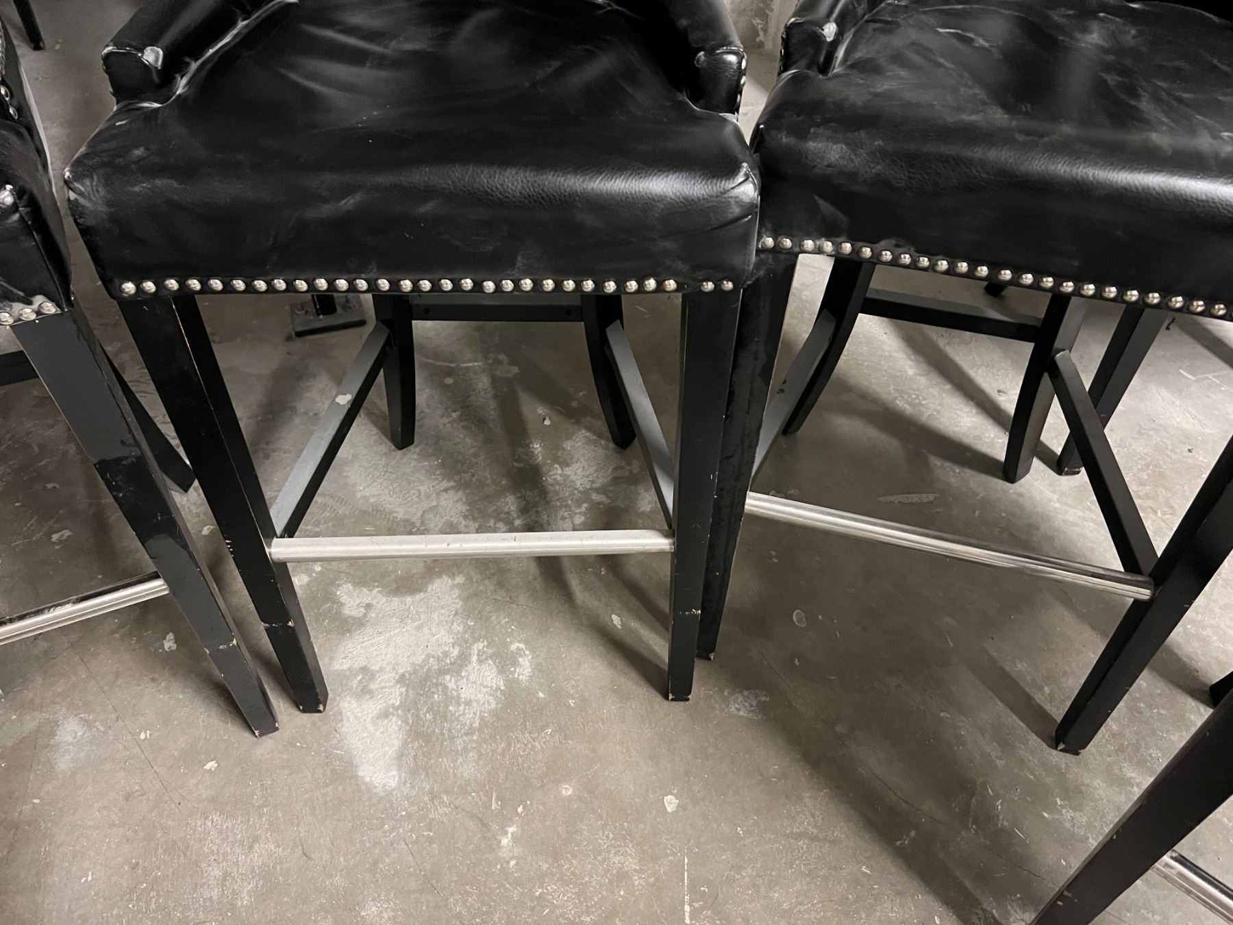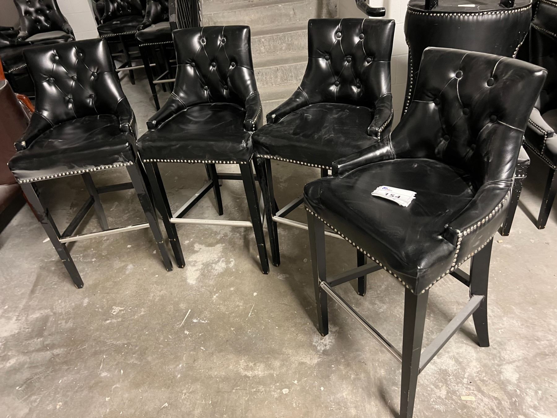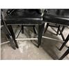 GROUP OF 4 BLACK UPHOLSTERED CHAIRS. SEAT HEIGHT IS 30". NOTE EACH CHAIR SEEMS TO HAVE A SMALL WEAR SPOT ON THE FRONT OF SOME ARMS