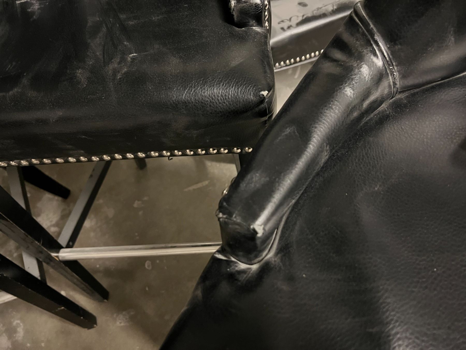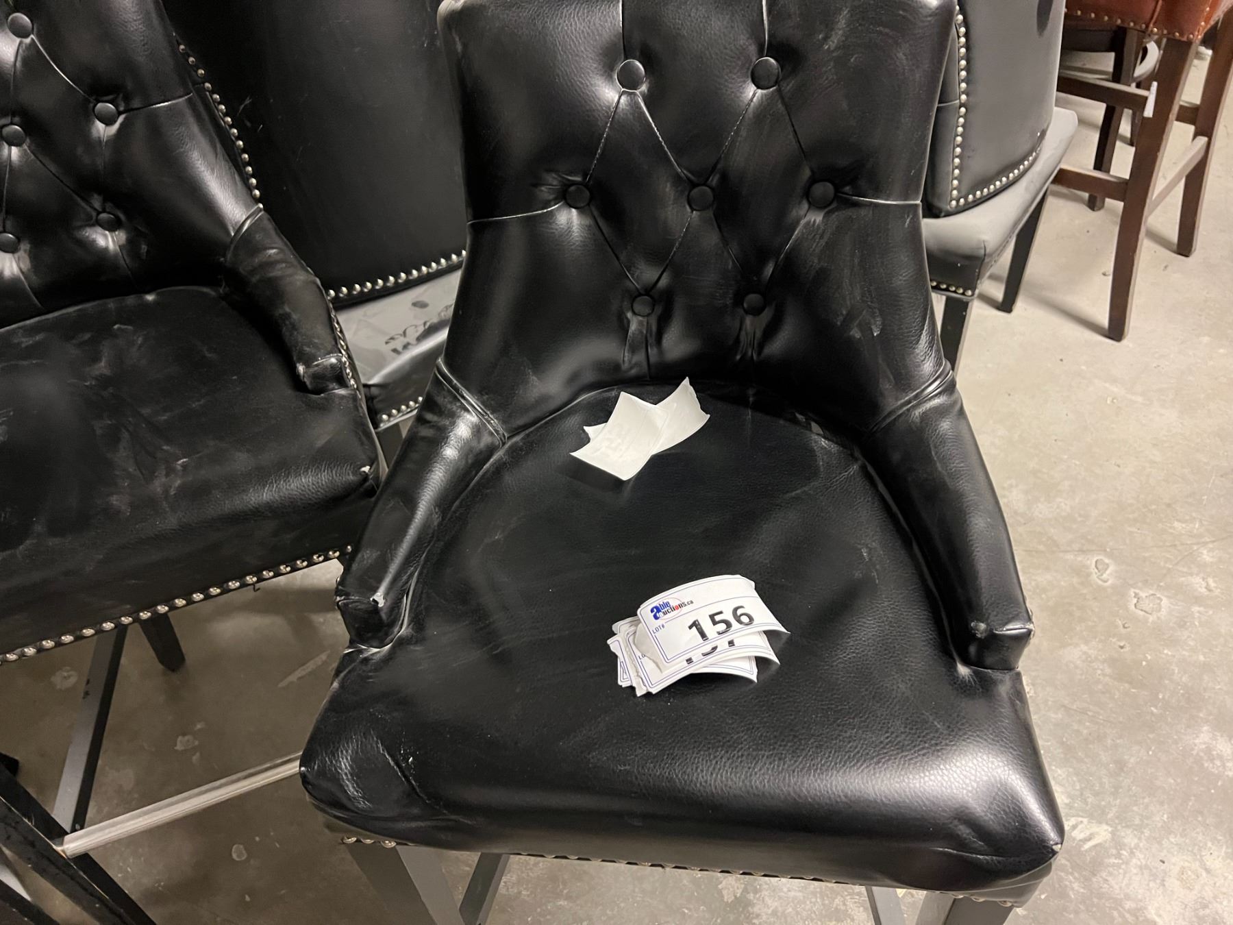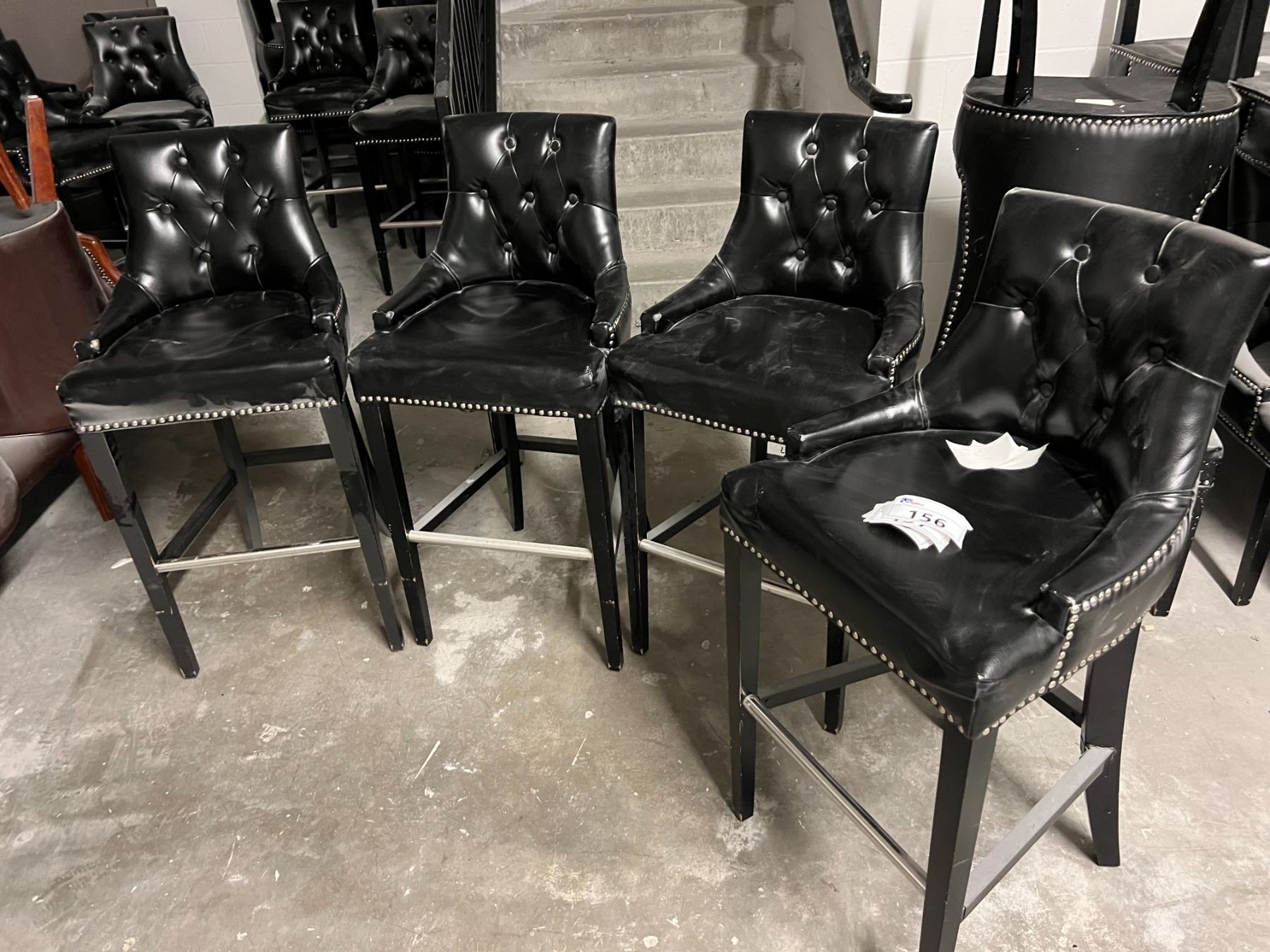 GROUP OF 4 BLACK UPHOLSTERED CHAIRS. SEAT HEIGHT IS 30". NOTE EACH CHAIR SEEMS TO HAVE A SMALL WEAR