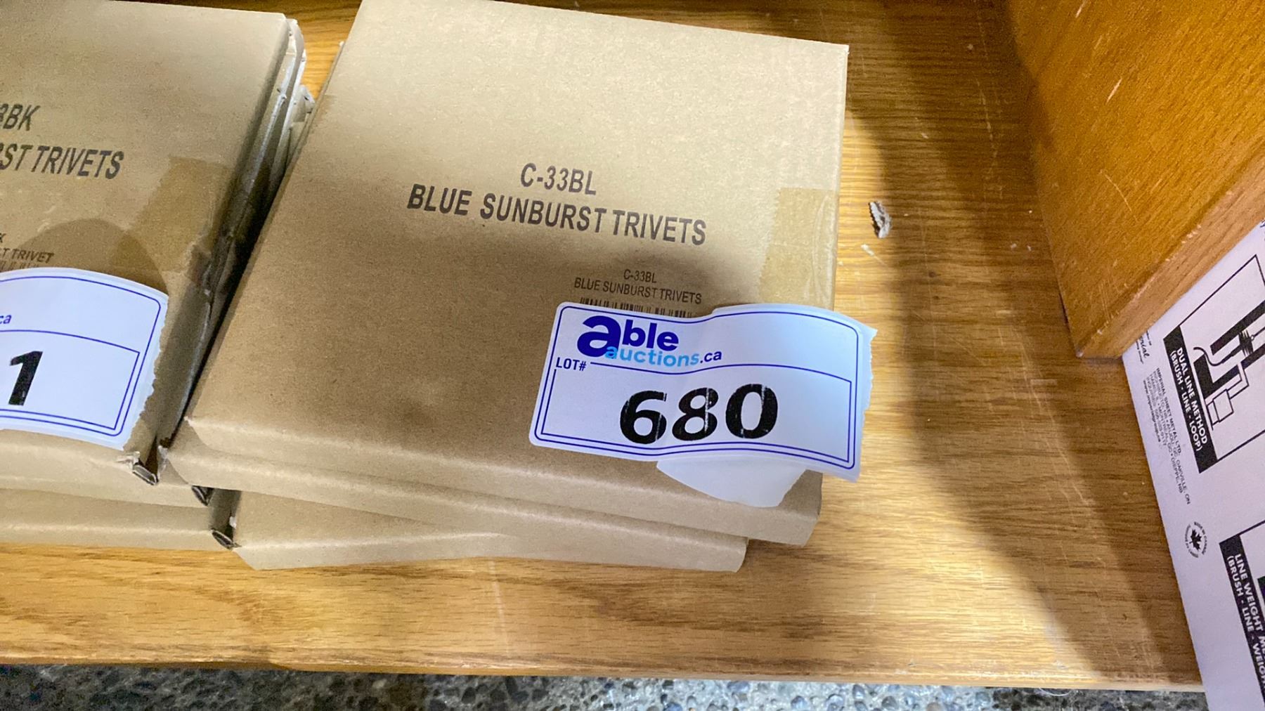 GROUP OF 4 BLUE SUNBURST CAST IRON TRIVETS. RETAIL $300