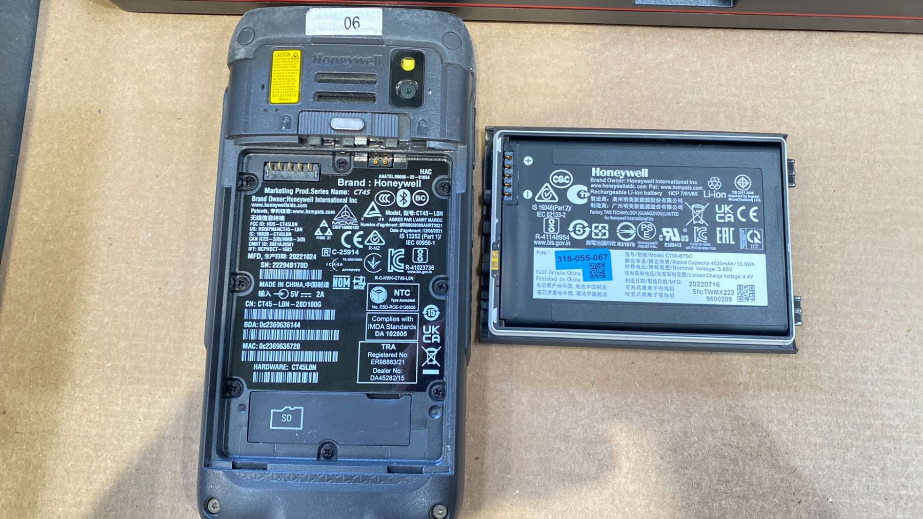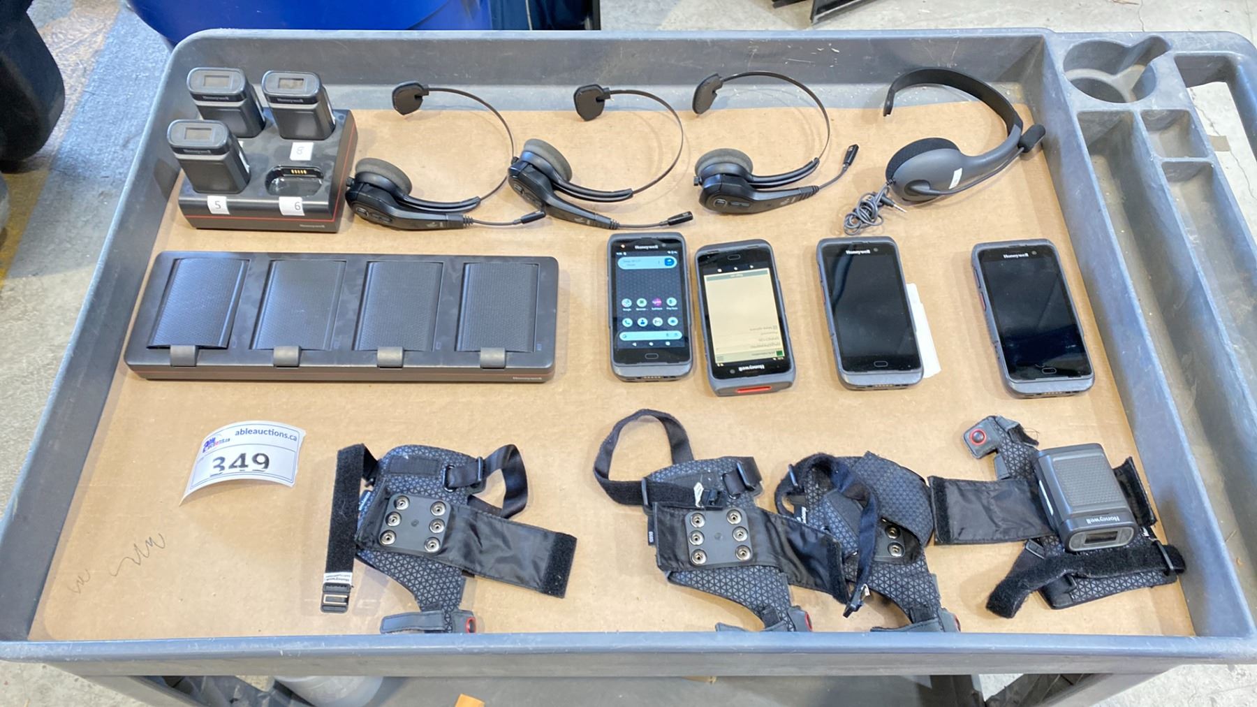 GROUP OF 4 HONEYWELL HANDHELD SCANNERS MODEL CT45, 4 GLOVE SCANNER SYSTEMS MODEL 8680I, 4 HEADSETS (1 PLUG IN AND 3 WIRELESS, CHARGING DOCKS AND 4 SPARE BATTERIES. RETAIL VALUE $15,000
