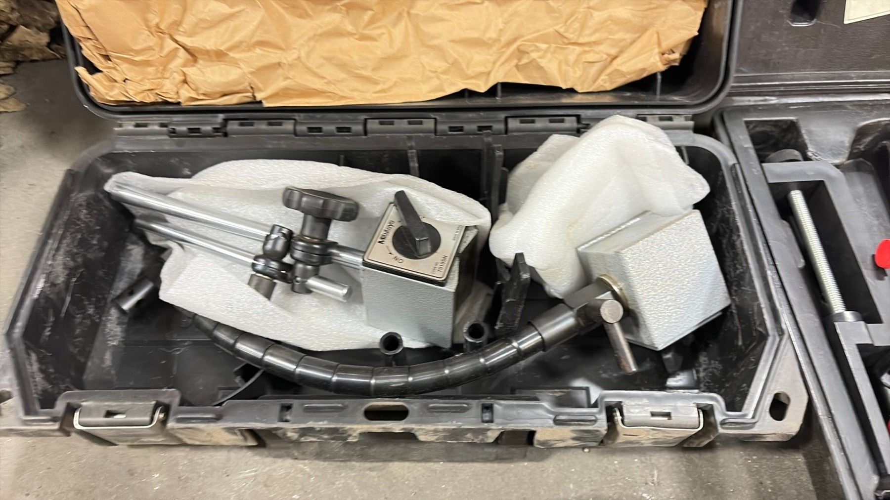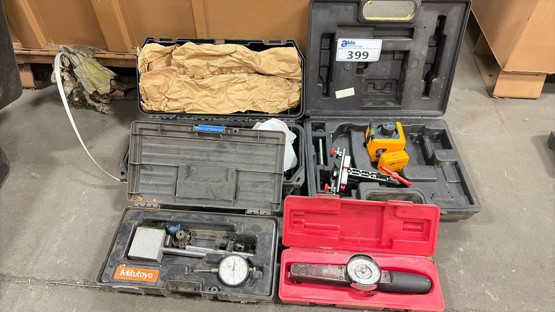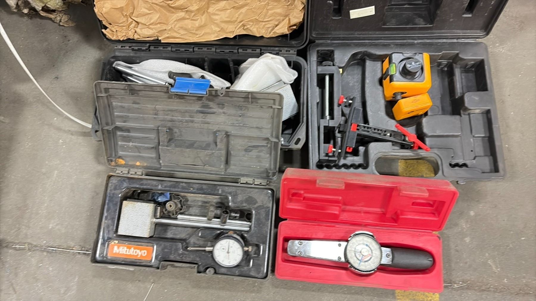 GROUP OF 4 TOOLS - DIAL TORQUE WRENCH, LASER CHALK LINE, 3 MITUTOYO MAGNETIC STANDS AND 1 DIAL INDICATOR