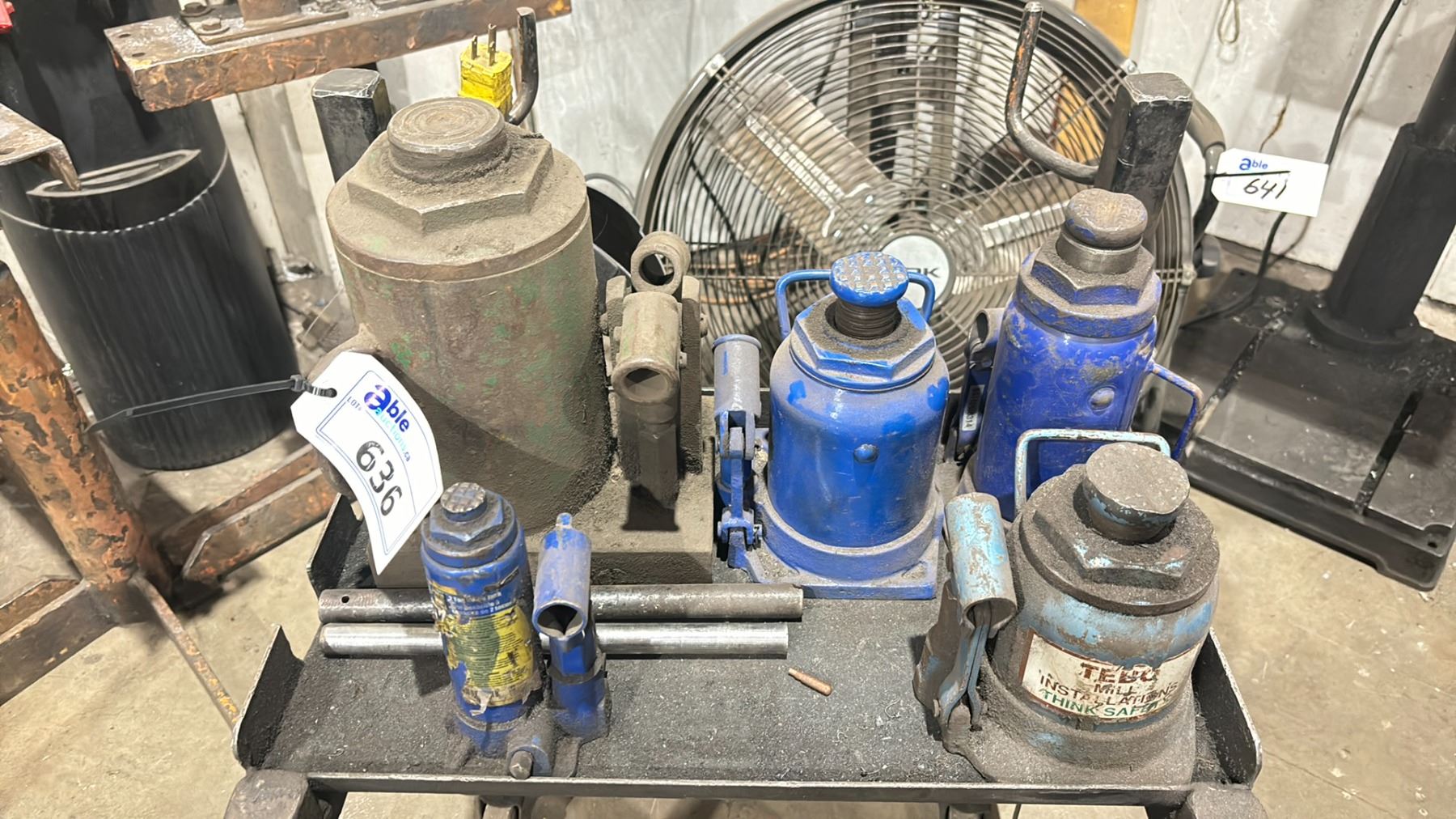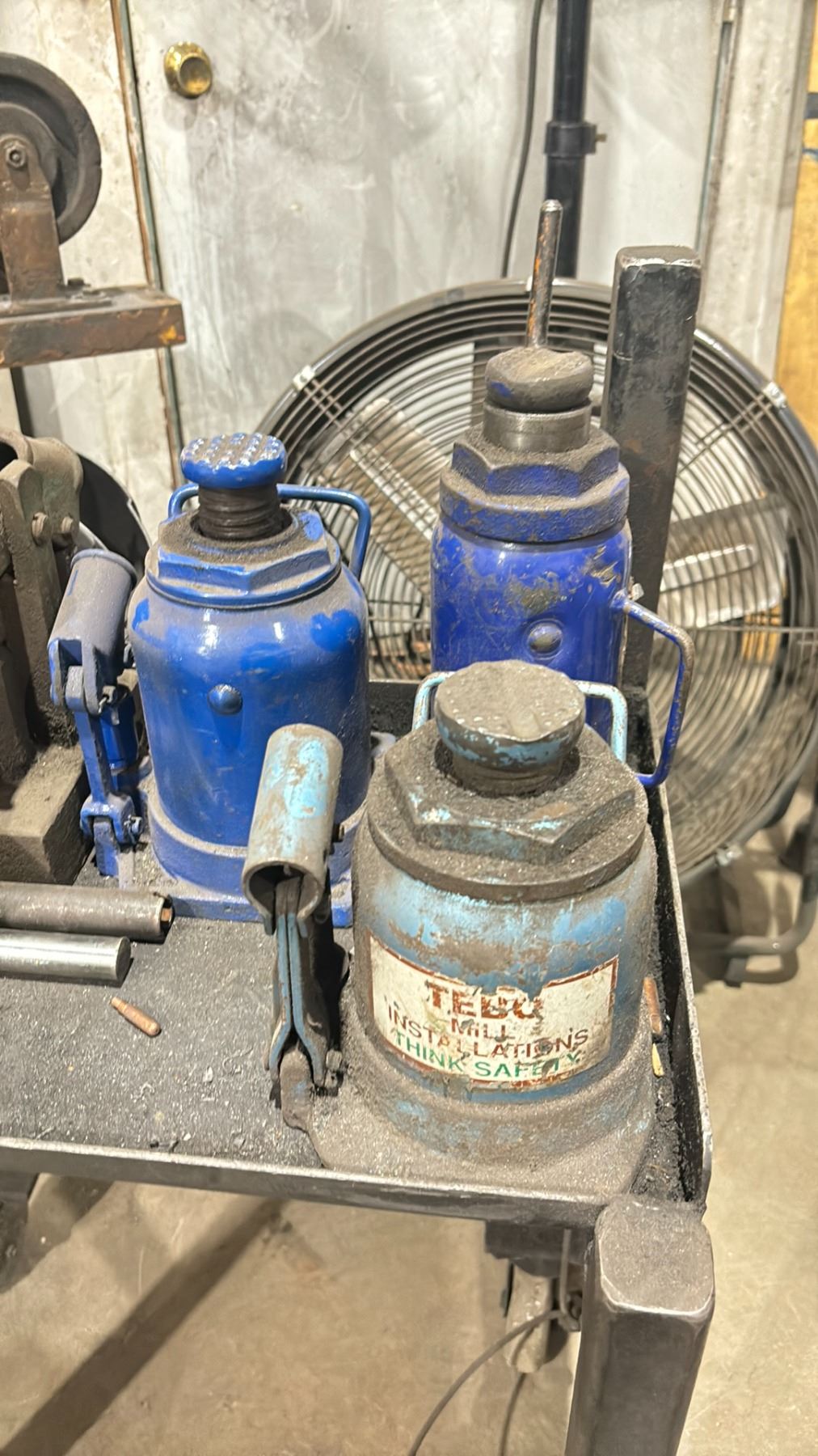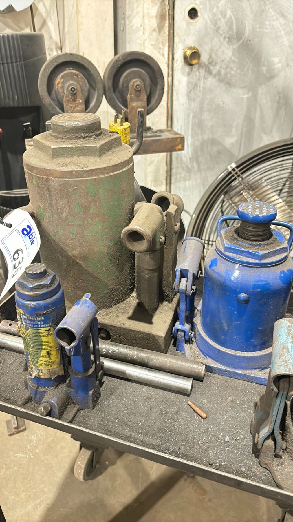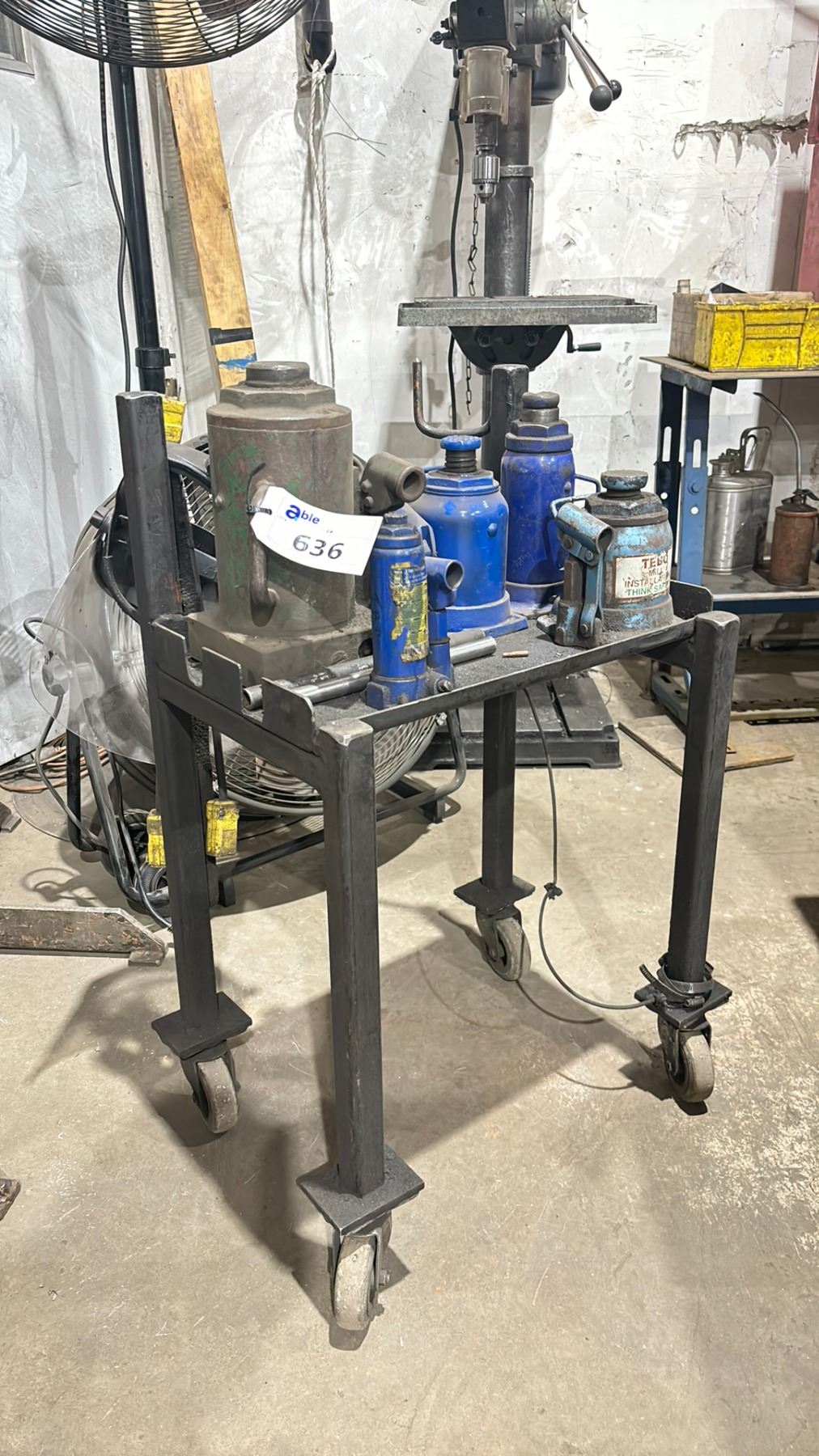 GROUP OF 5 ASSORTED BOTTLE JACKS WITH METAL MOBILE WORK CART
