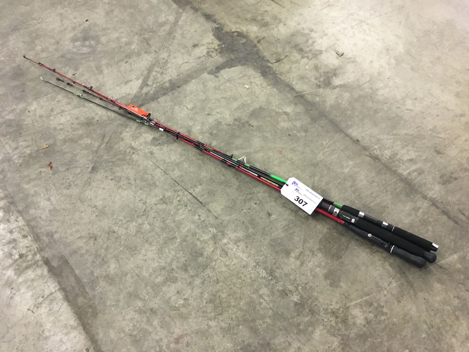 GROUP OF 5 ASSORTED FISHING RODS OF VARIOUS LENGTHS AND TYPES