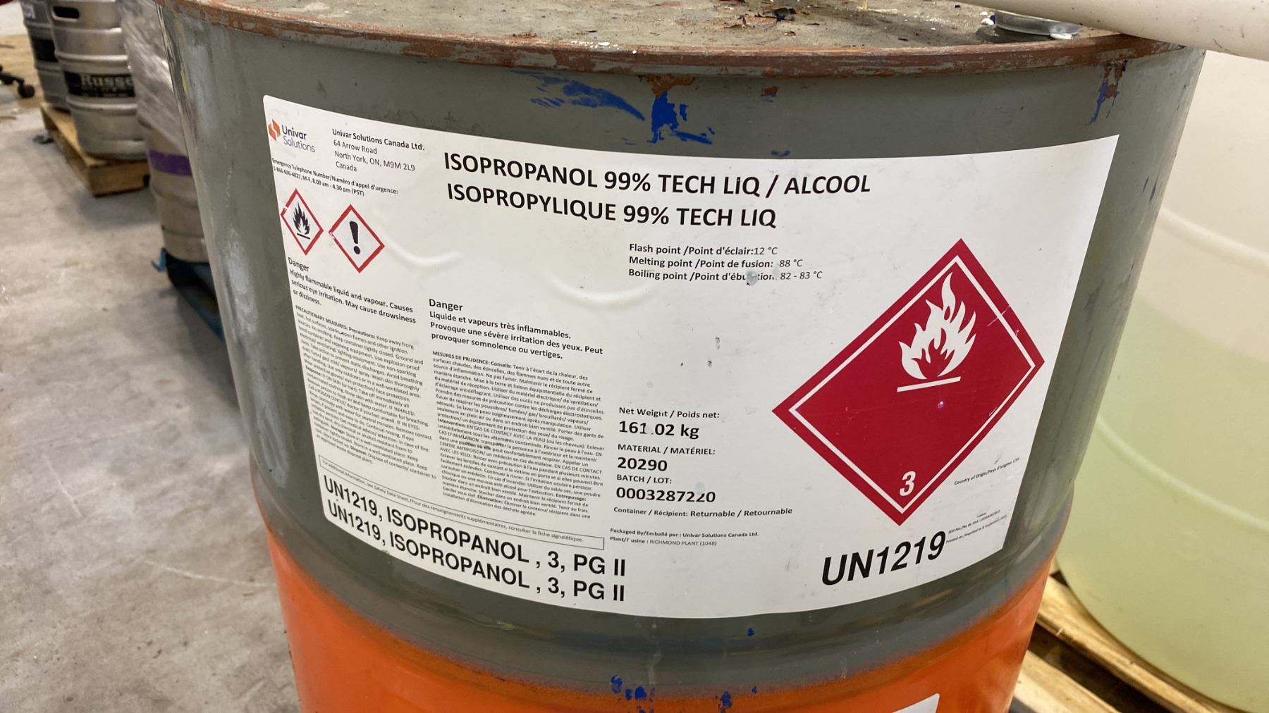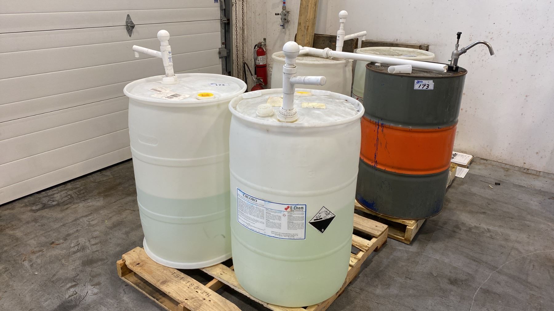 GROUP OF (5) BARRELS OF ASSORTED LIQUID CHEMICAL COMPOUNDS (VARIOUS AMOUNTS LEFT) - CHLORINATED FOAMING CLEANER, PERACETIC ACID BASED LIQUID SANITIZER, (2) NON-FOAMING BLENDS OF ACID AND ISOPROPANOL