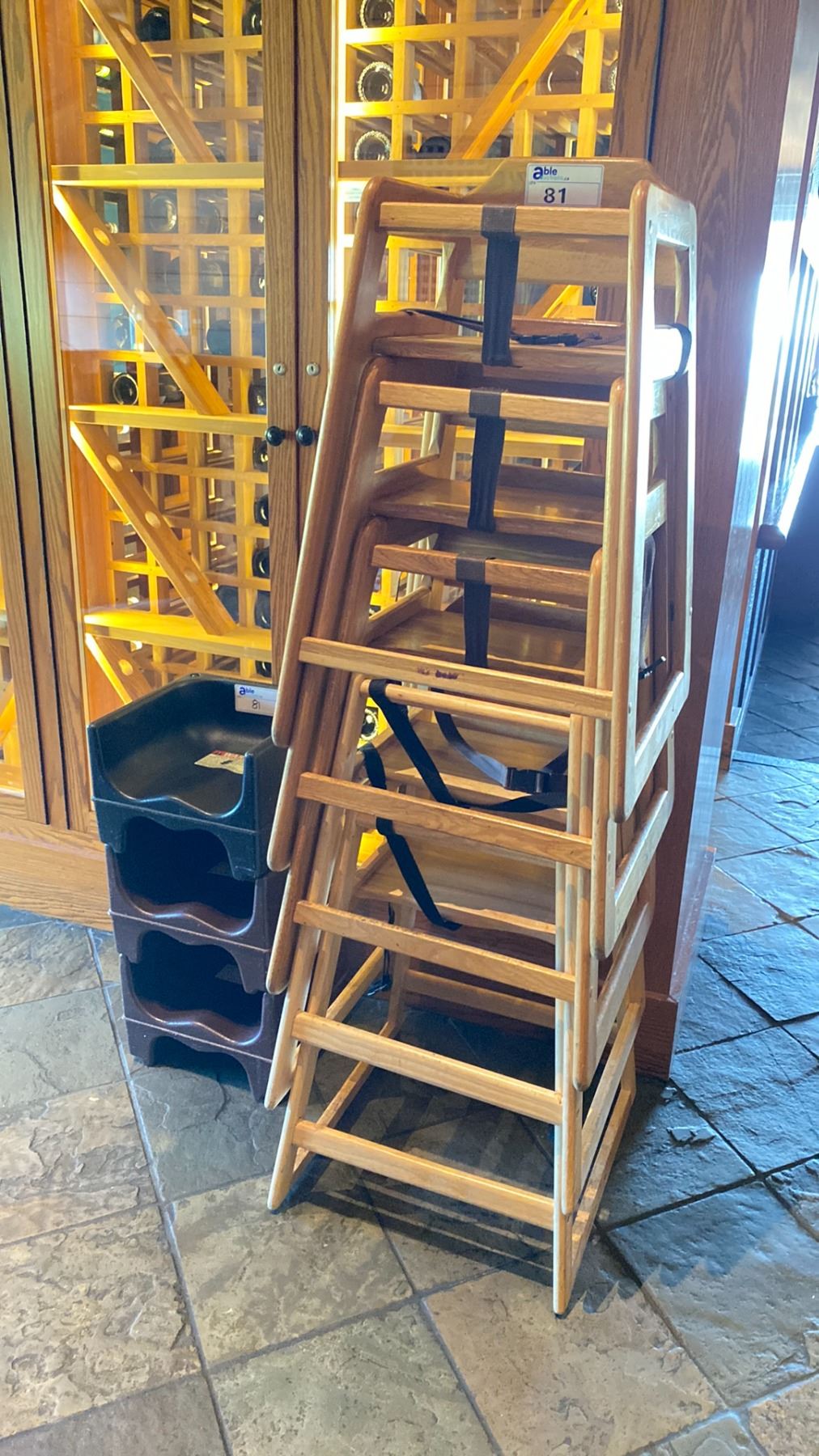 GROUP OF 5 CHILDRENS WOODEN HIGH CHAIRS, 3 CHILDREN PLASTIC BOOSTER SEATS