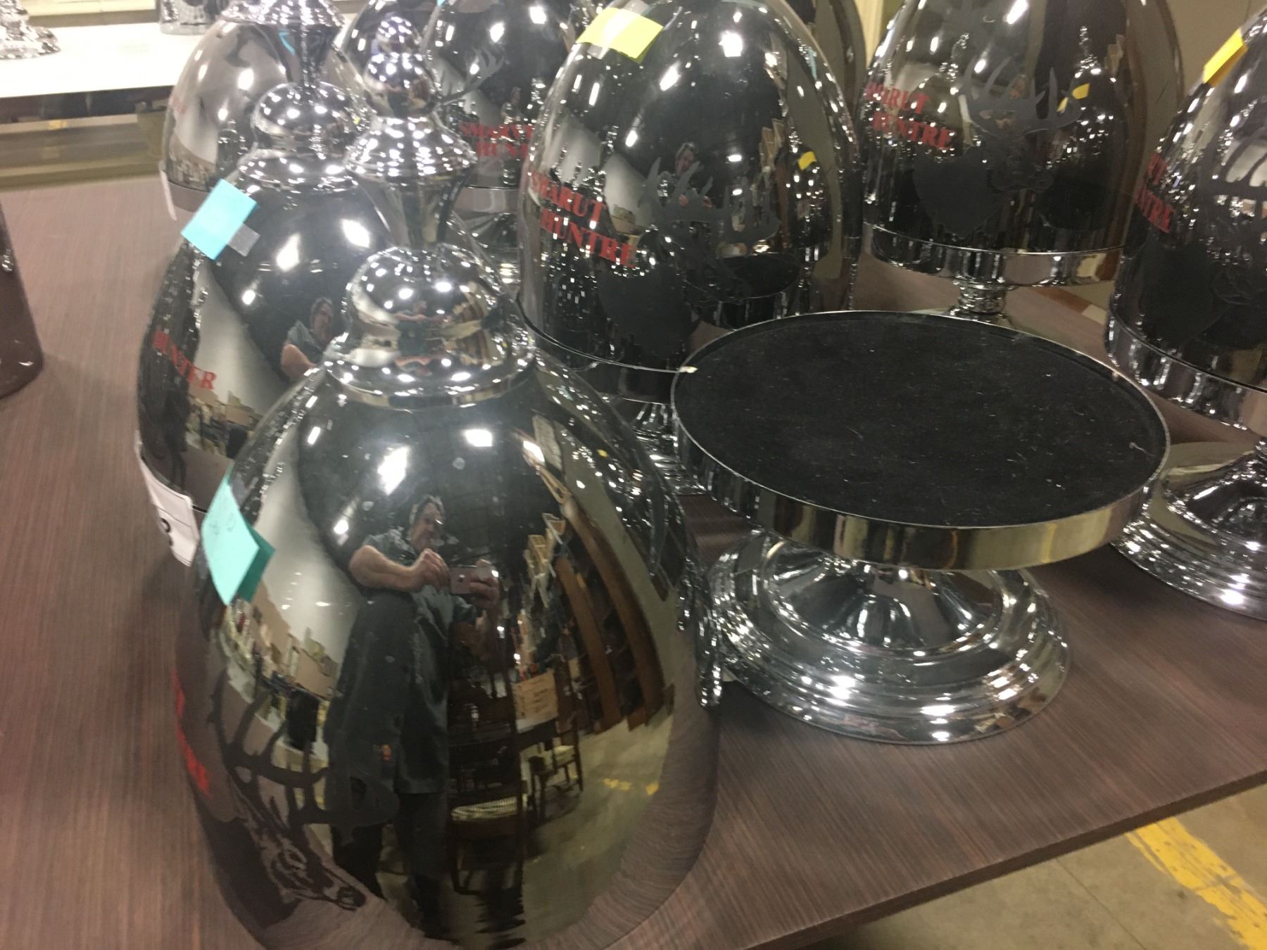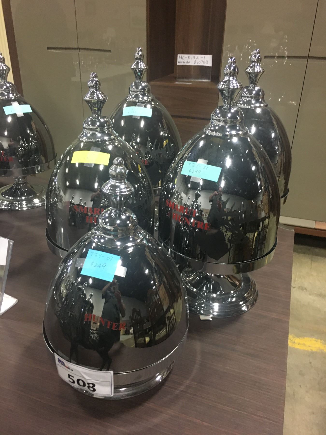 GROUP OF 5 CHROME FINISH & GLASS 2PC DOME TOP PEDESTAL DISPLAY STANDS