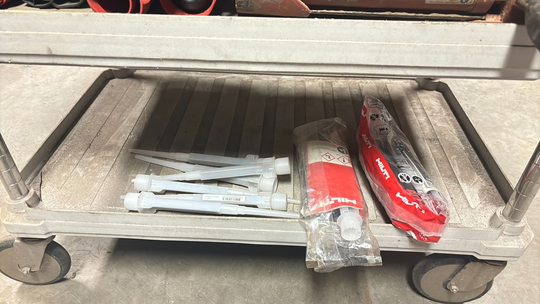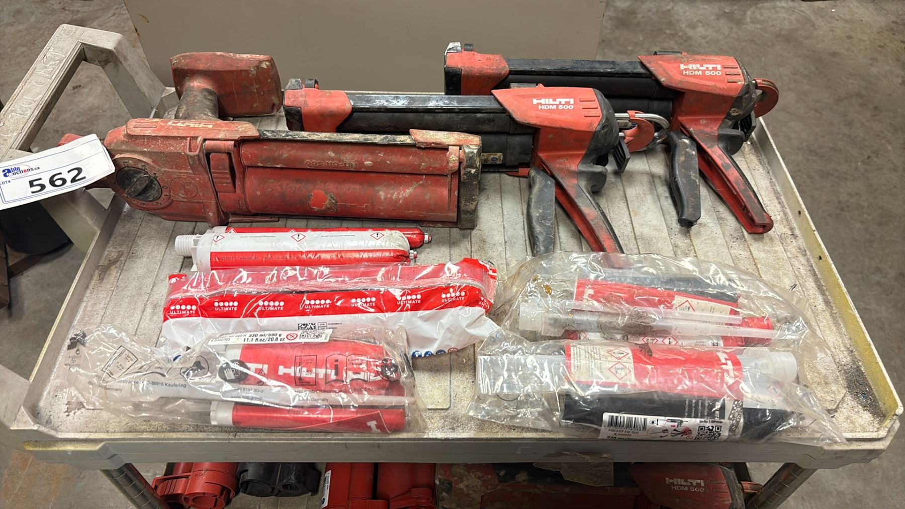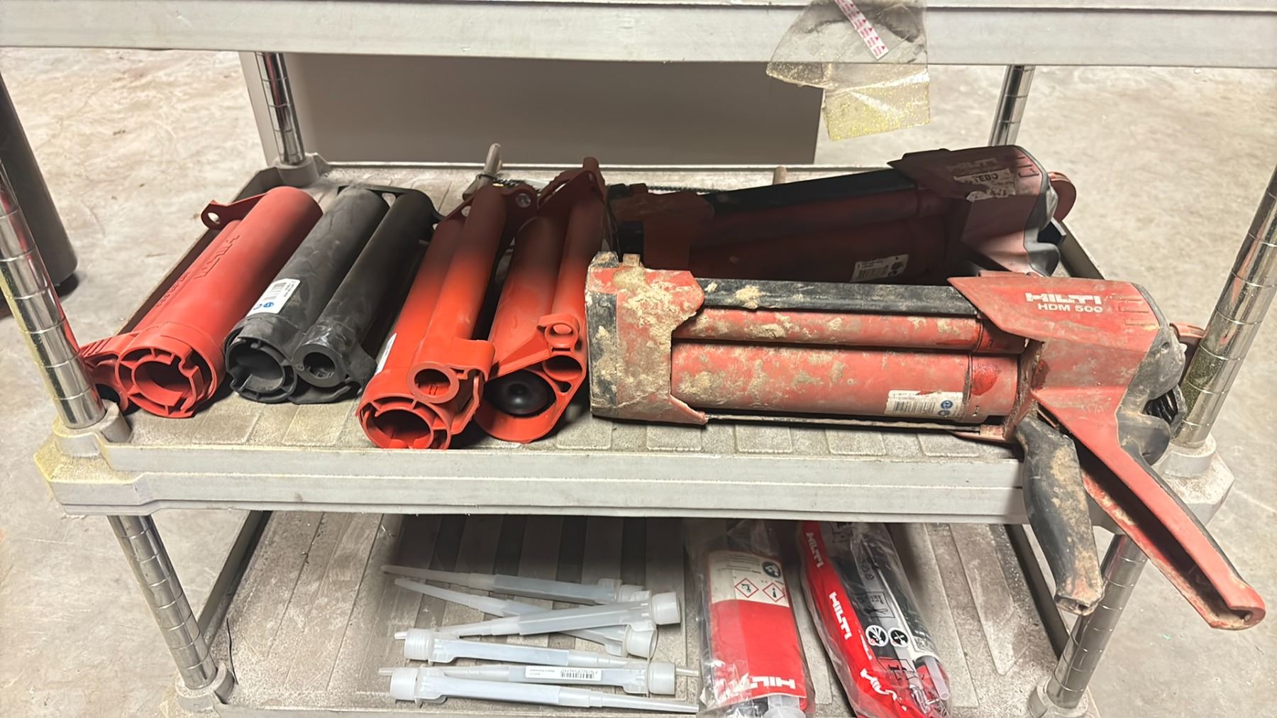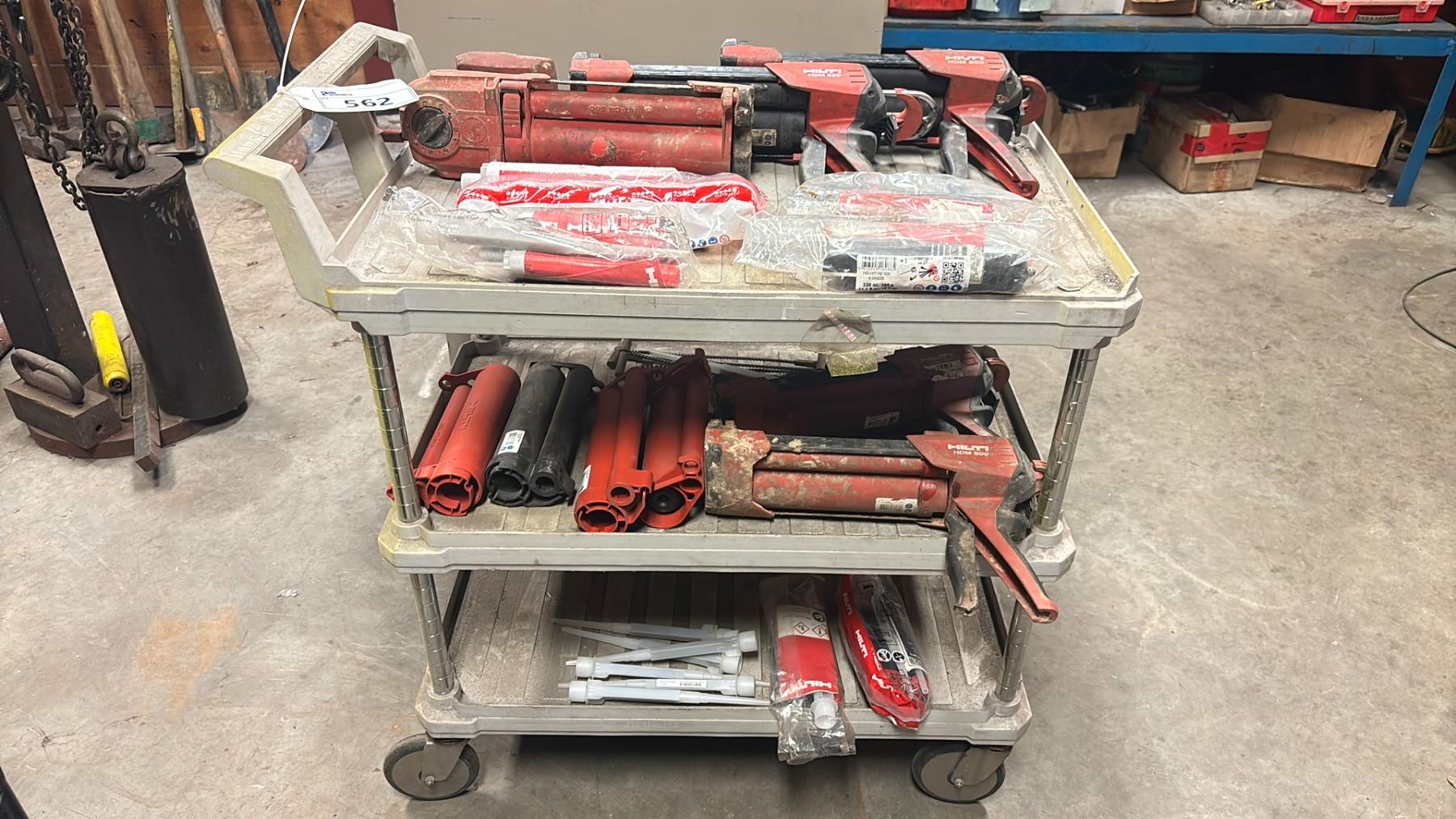 GROUP OF 5 HILTI HDM500 MANUAL ADHESIVE DISPENSERS WITH ACCESSORIES & ROLLING SHOP CART