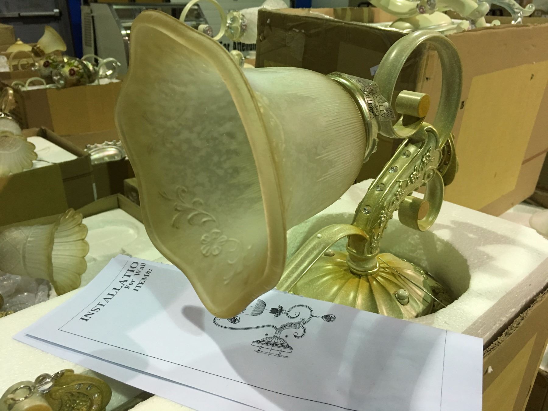 GROUP OF 5 PALE WHITE AND GOLD JEWELED SINGLE LIGHT WALL SCONCES