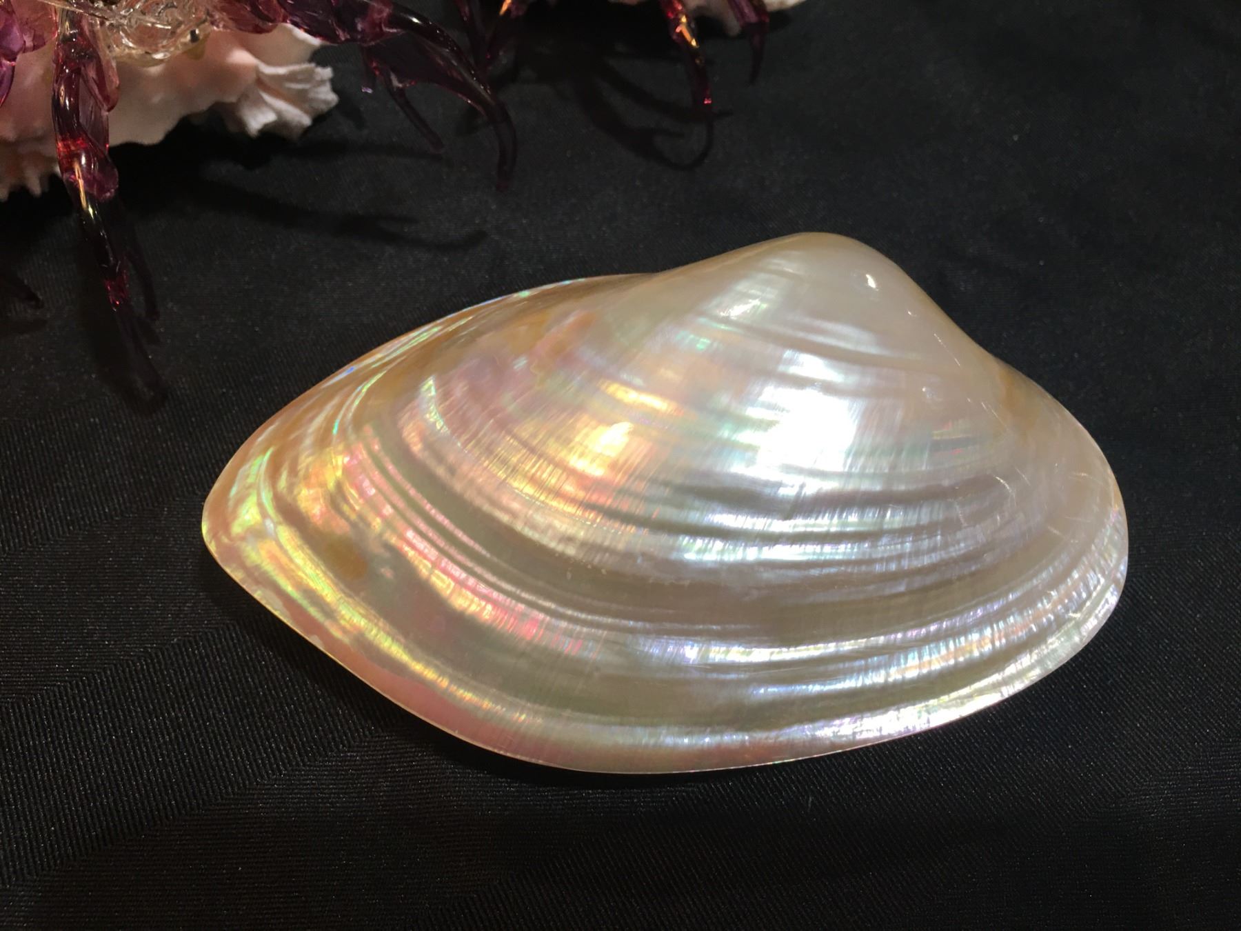 GROUP OF 5 SHELLS WITH BLOWN GLASS HERMIT CRABS. LARGEST CRAB MEASURES APPROX 5.5"