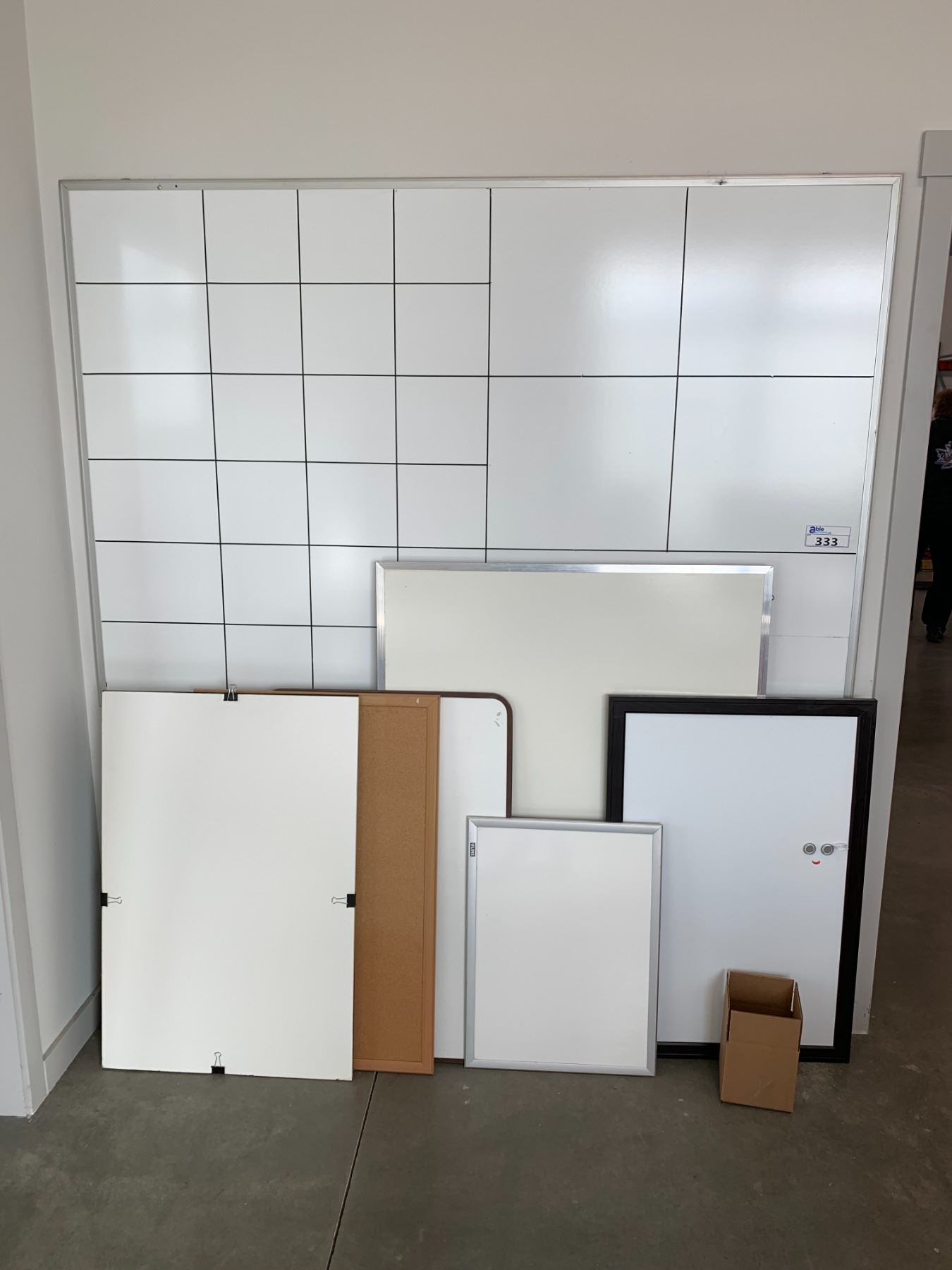 GROUP OF 6 ASSORTED WHITE BOARDS, 1 CORK BOARD AND BOX OF MARKERS