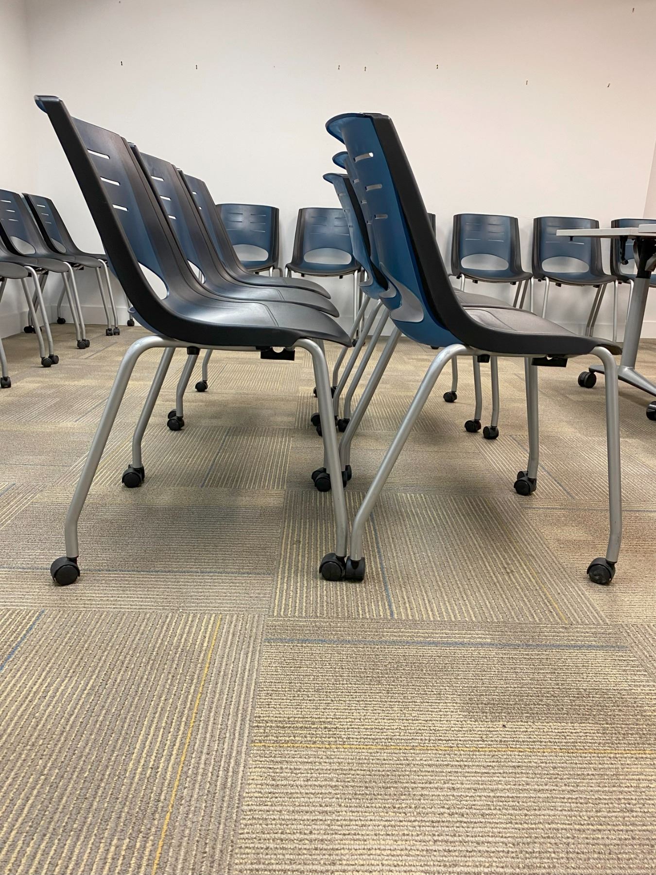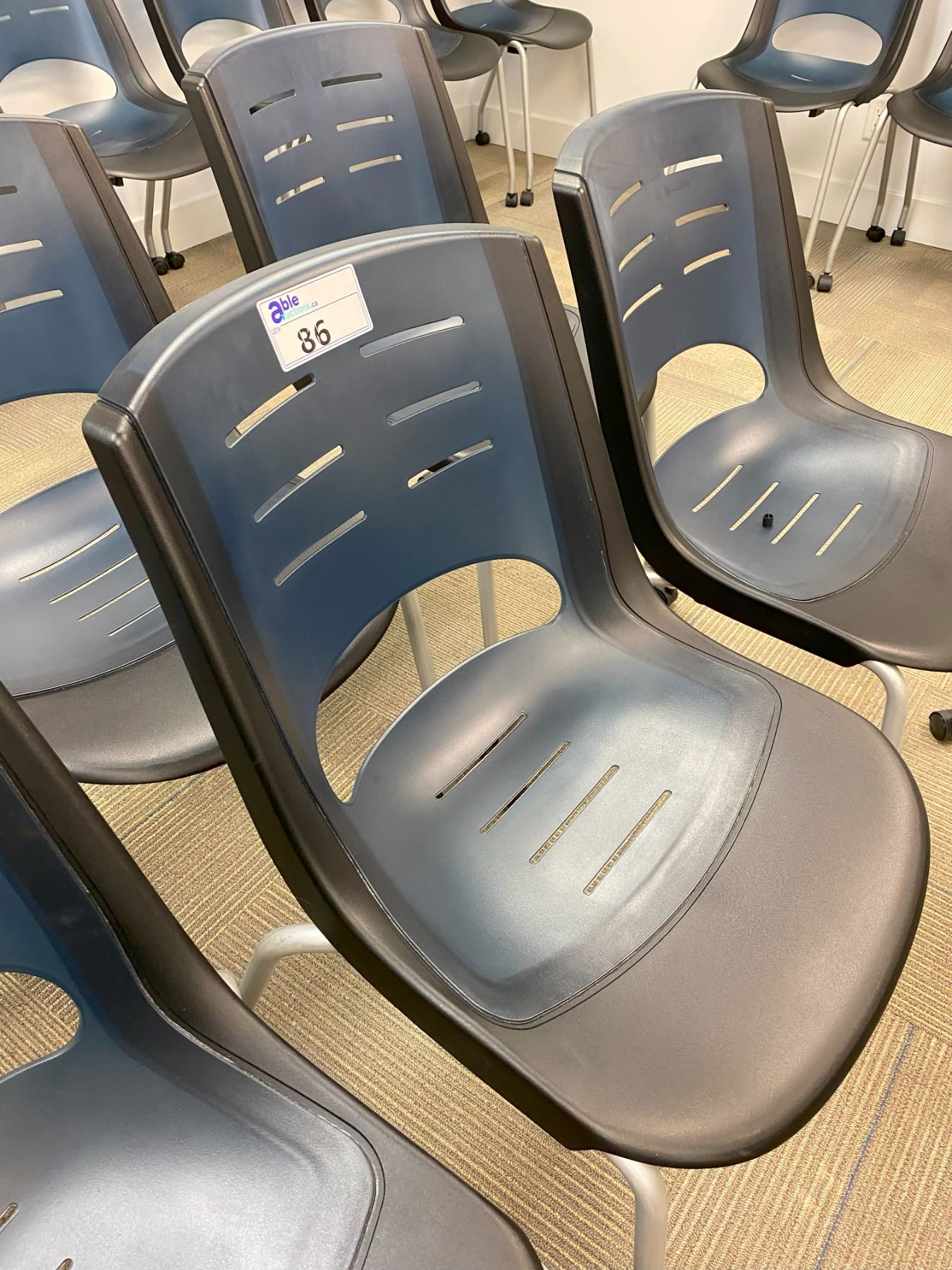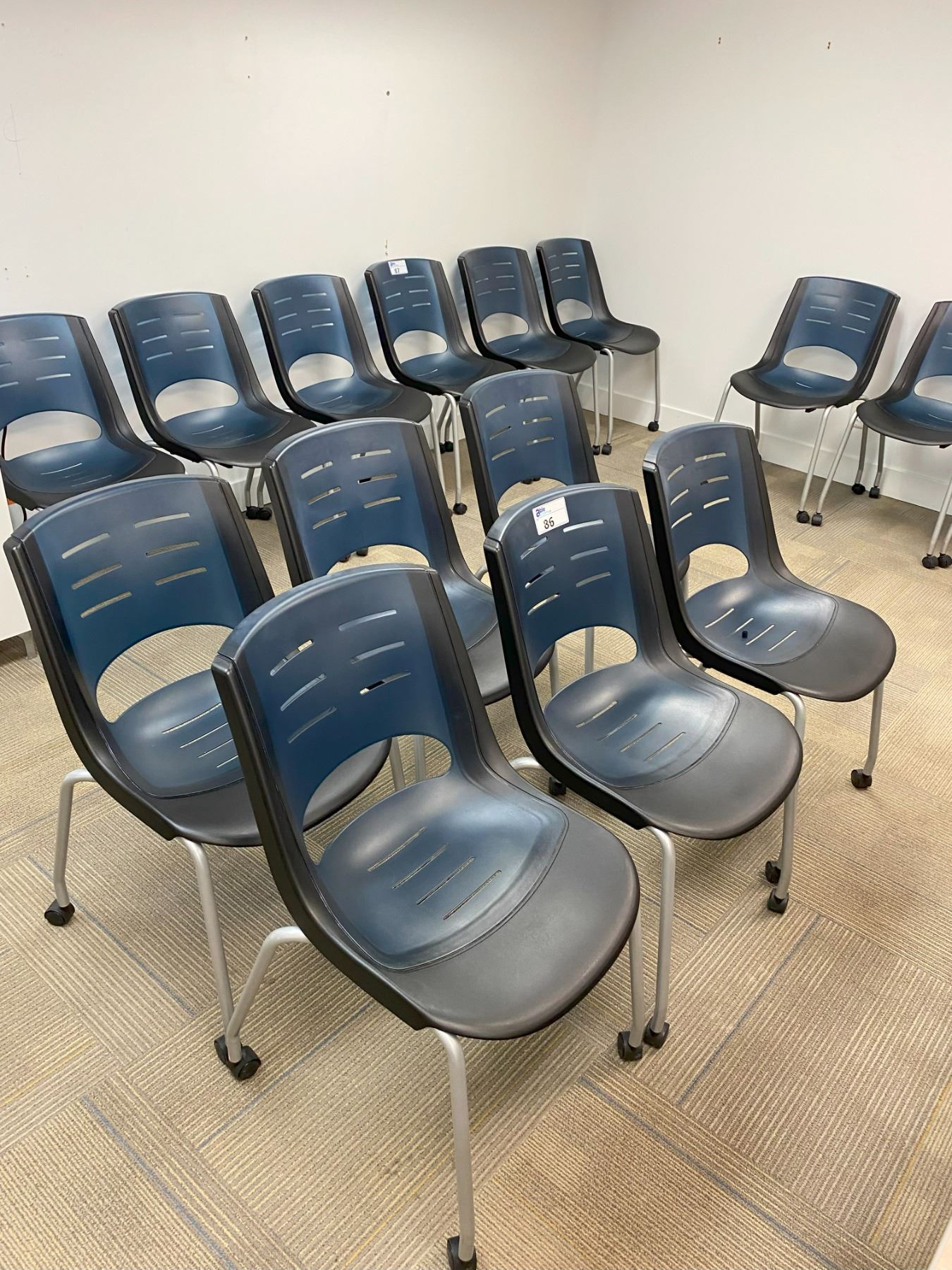 GROUP OF 6 BLUE & BLACK PLASTIC MOBILE WORK STATION CHAIRS