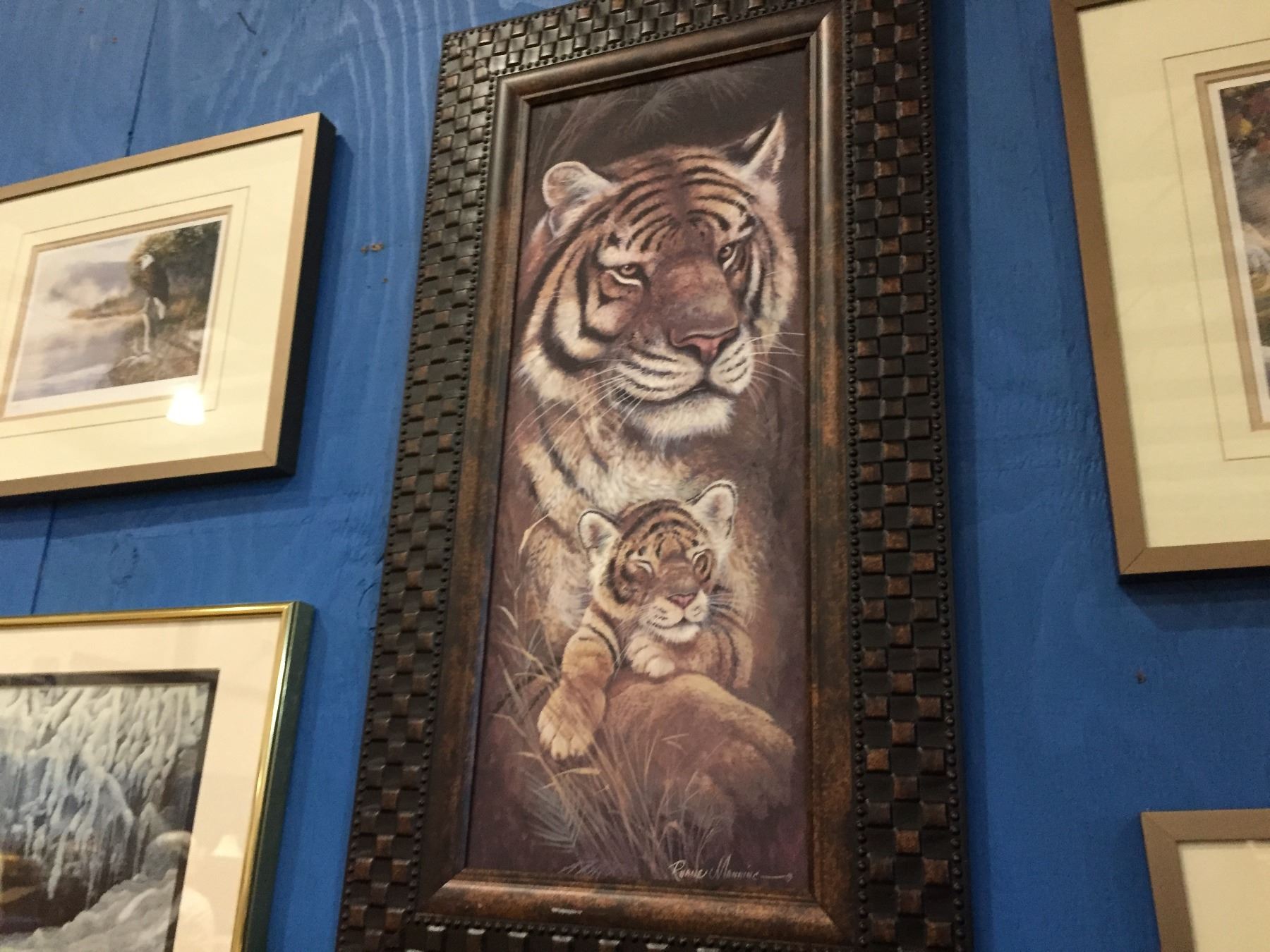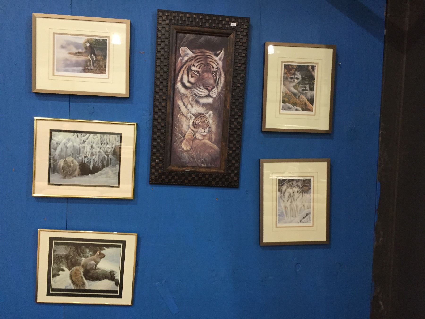 GROUP OF 6 FRAMED WILDLIFE PRINTS TIGER WITH CUB/RACOON/WOLF/SQUIRREL, BY ROBERT BATEMAN & ANDREW KISS & RUANE MANNING