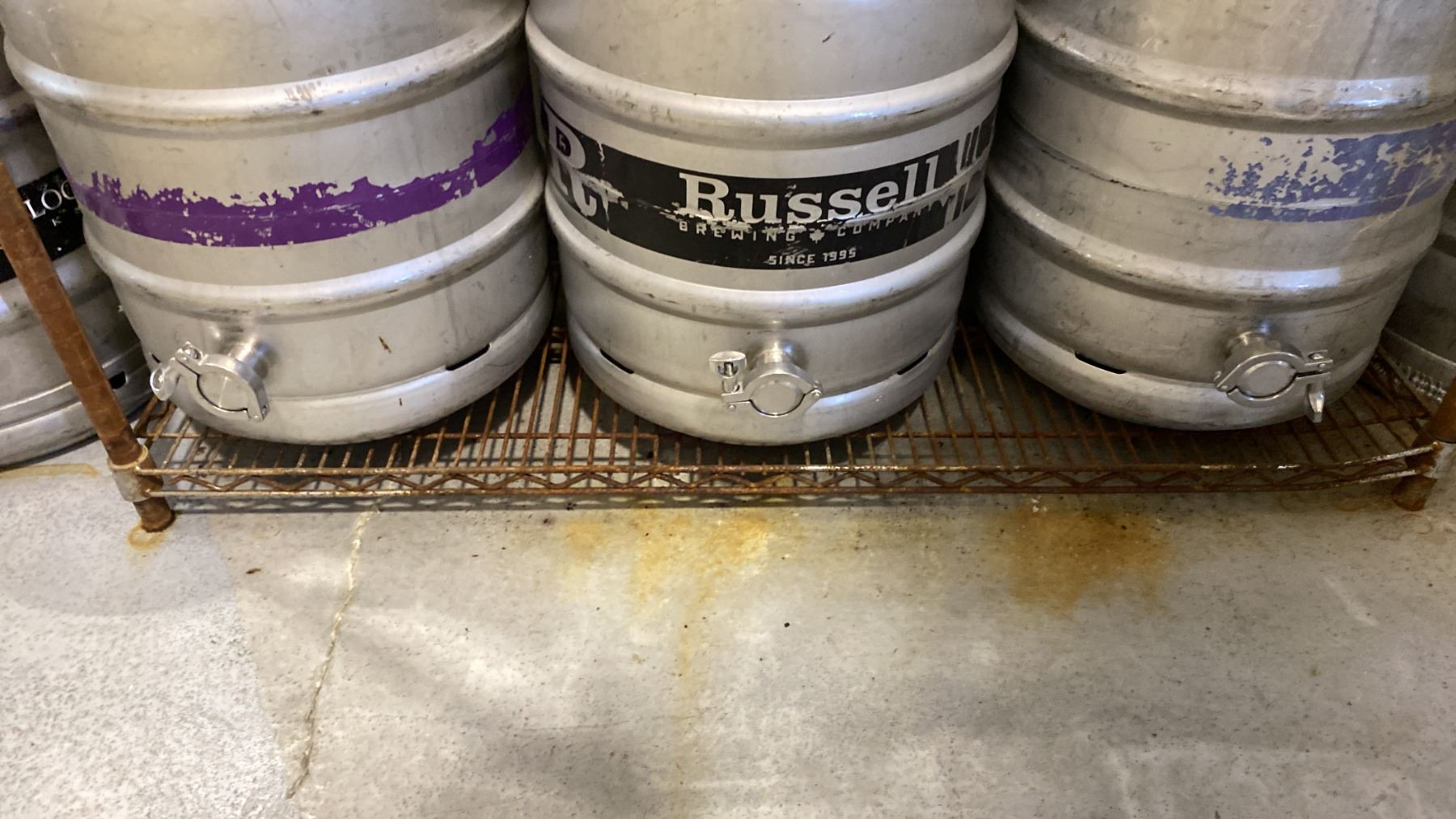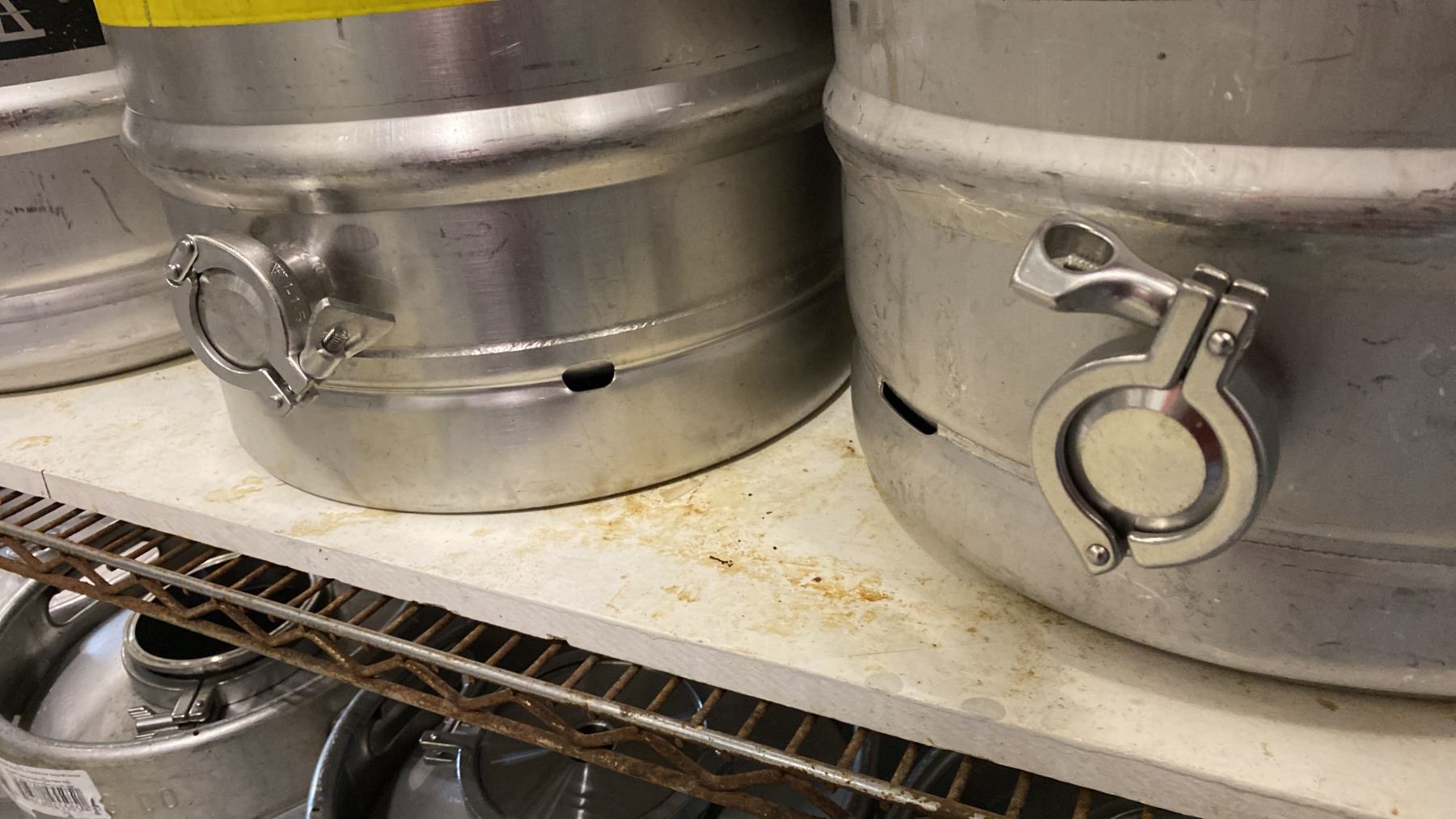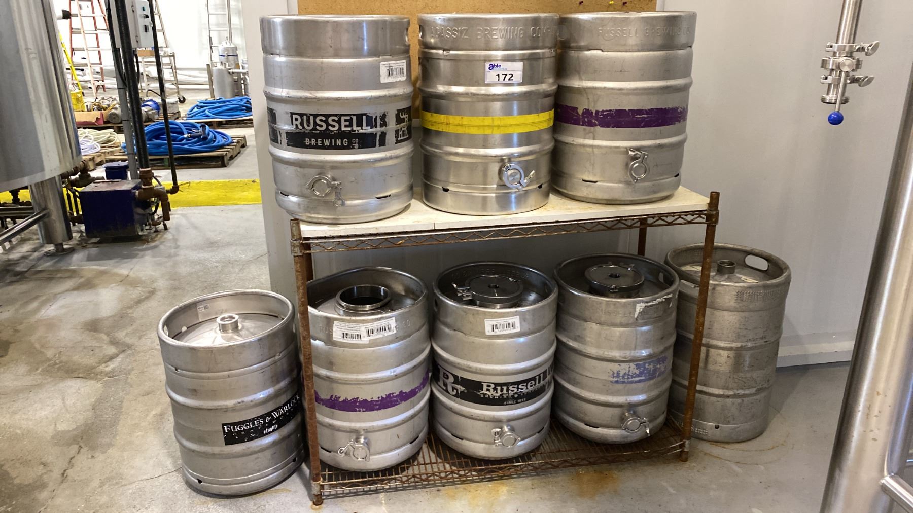 GROUP OF (6) MODIFIED 50 LITRE BEER KEGS, 2 REGULAR 50 LITRE BEER KEGS AND