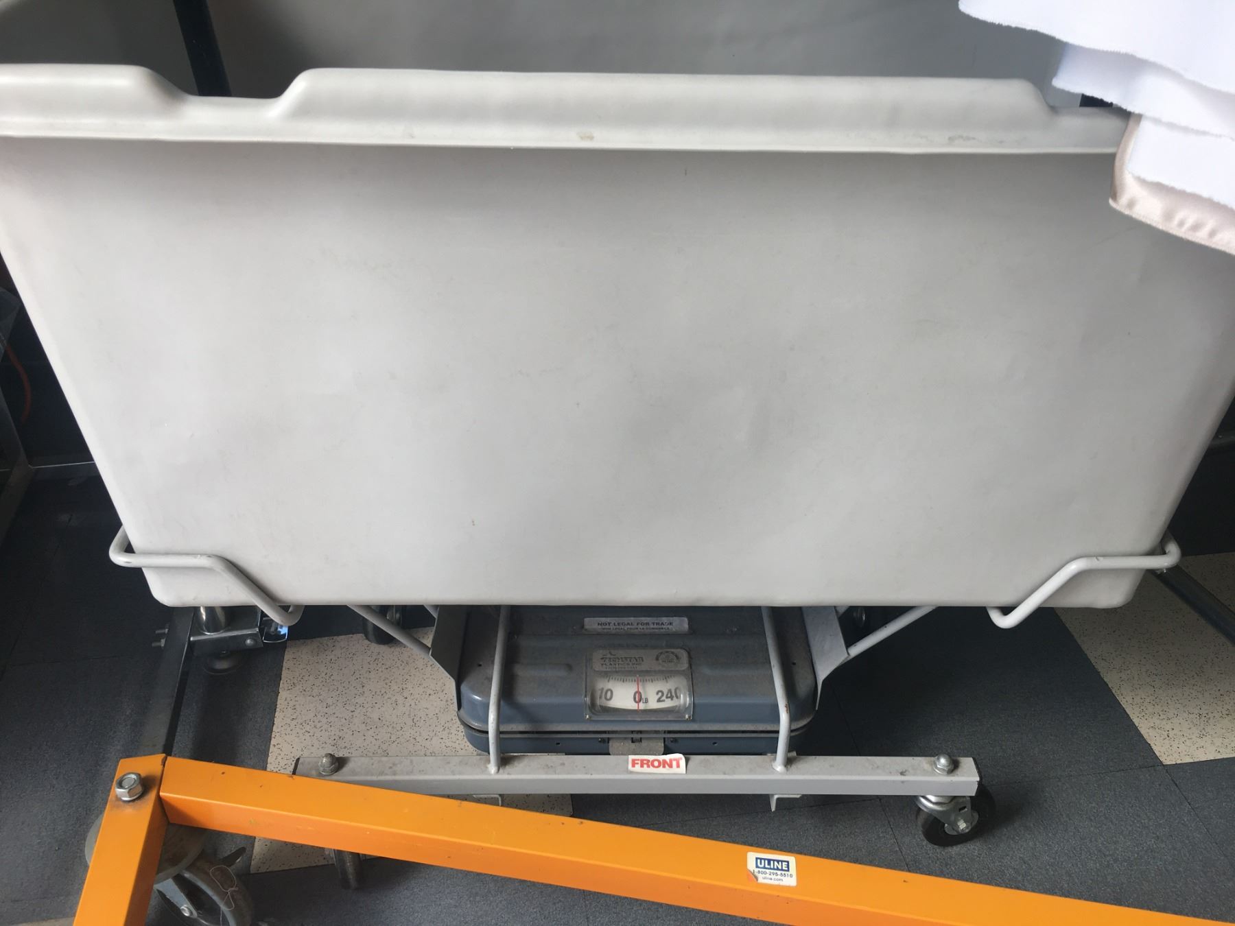 GROUP OF 7 ASSORTED COMMERCIAL LAUNDRY/DRY CLEANING ROLLING RACKS & BIN WITH WEIGH SCALE