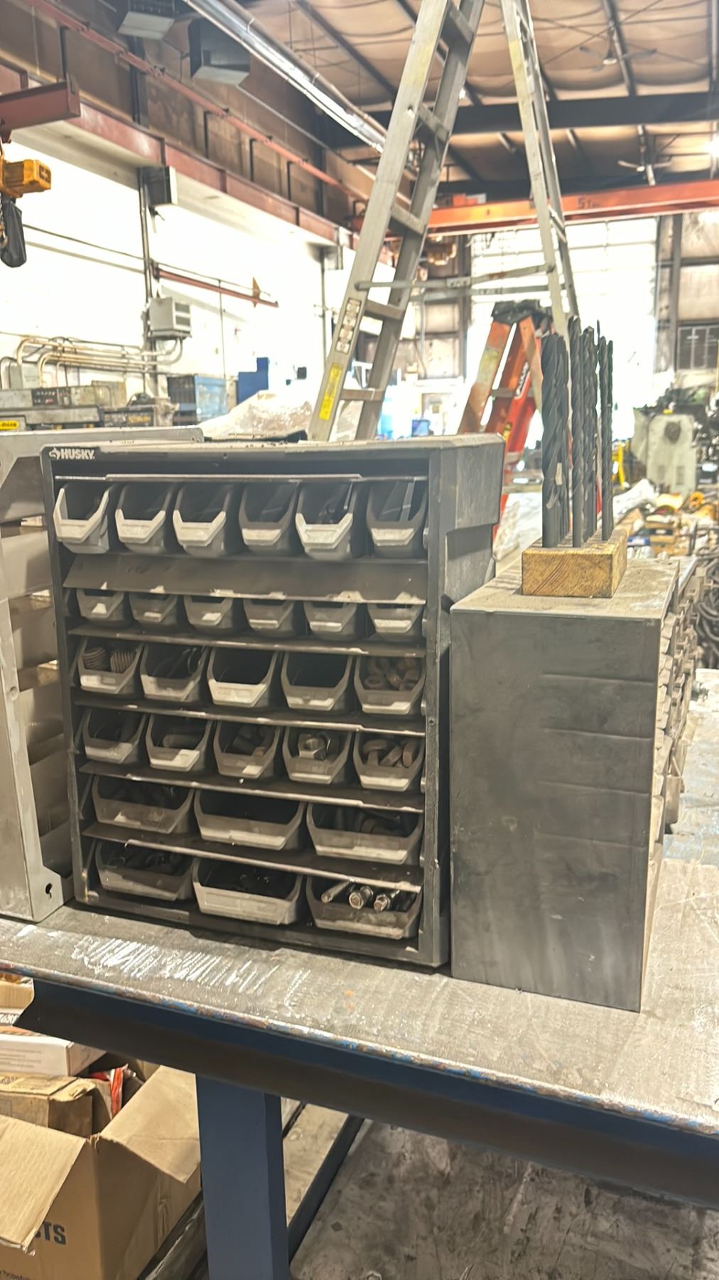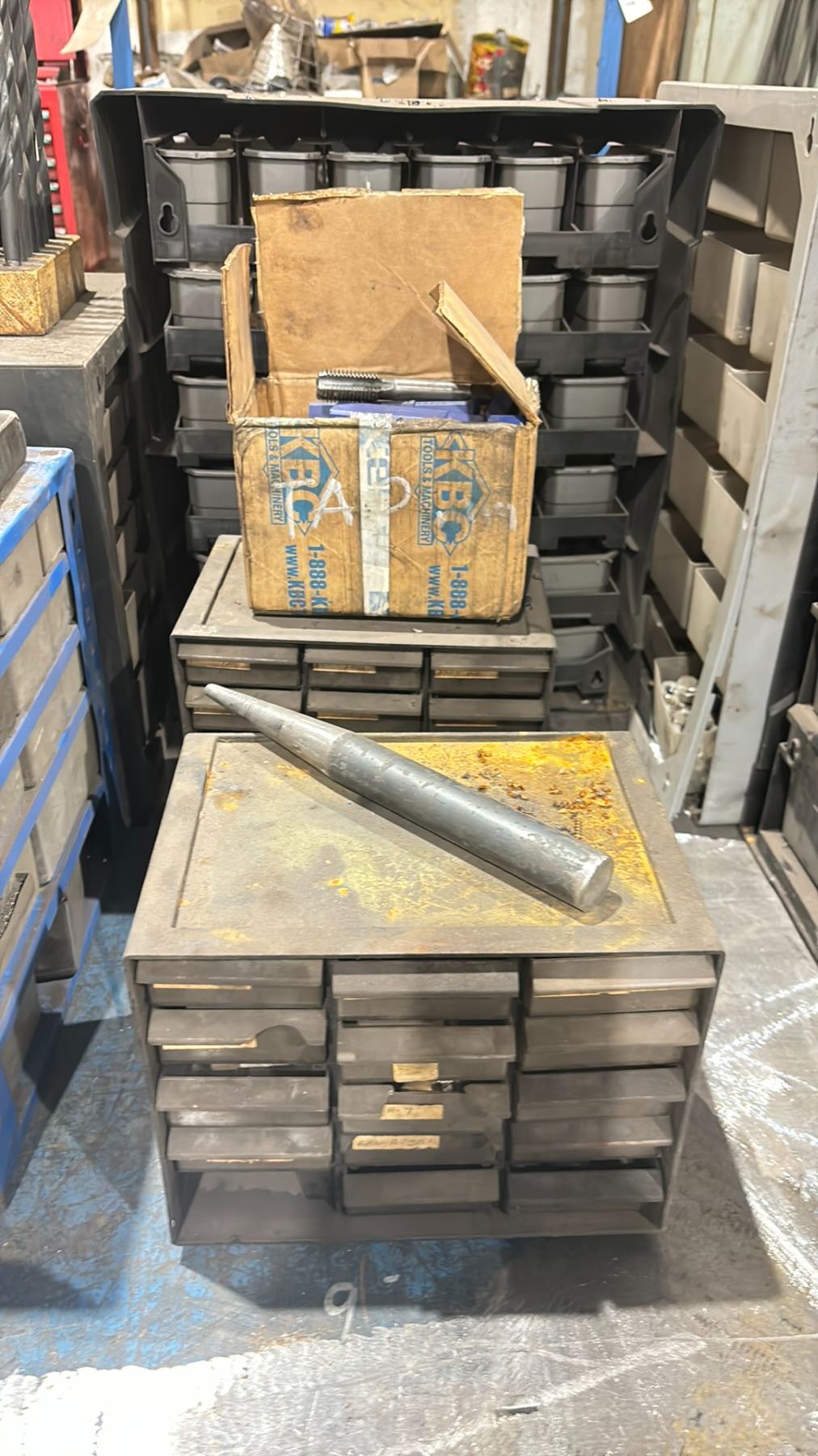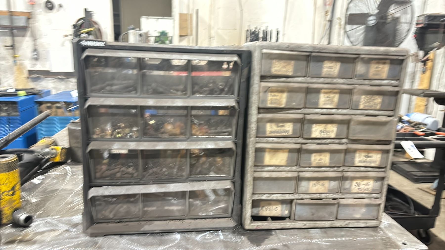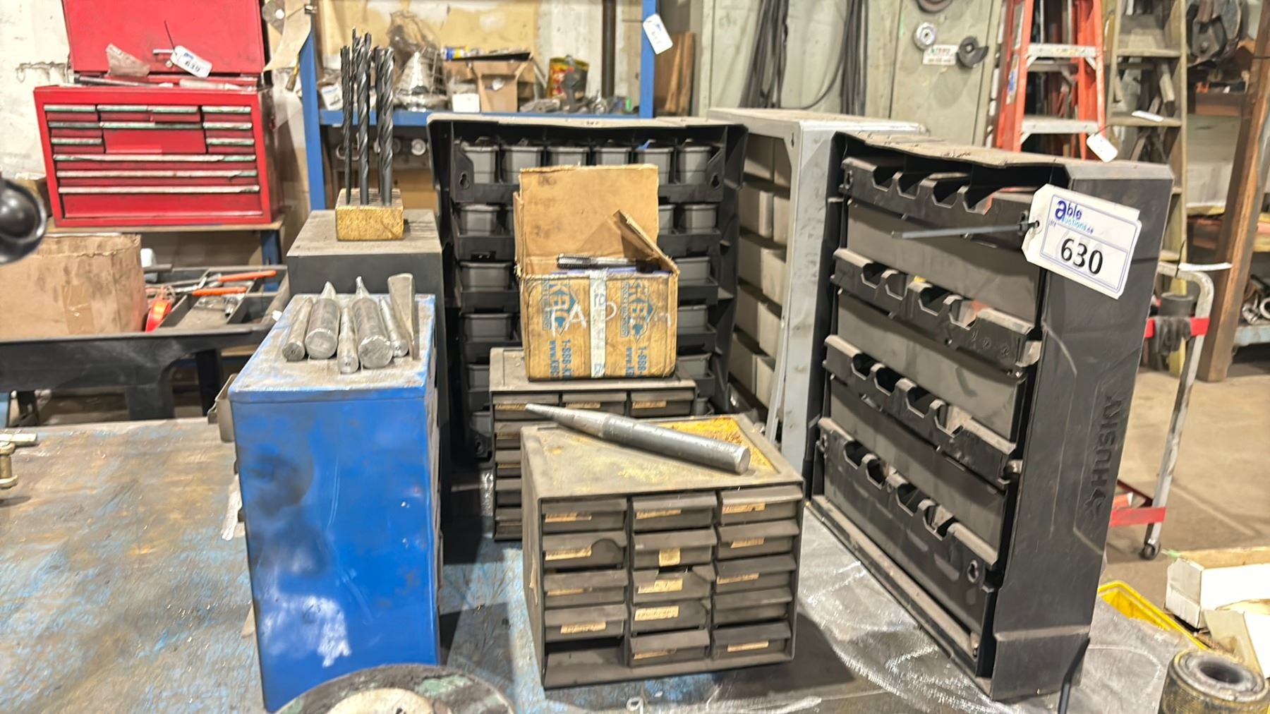 GROUP OF 7 SMALL PARTS ORGANIZER CABINETS & CONTENTS - DRILL BITS, TAPS, NUTS, BOLTS & ASSORTED